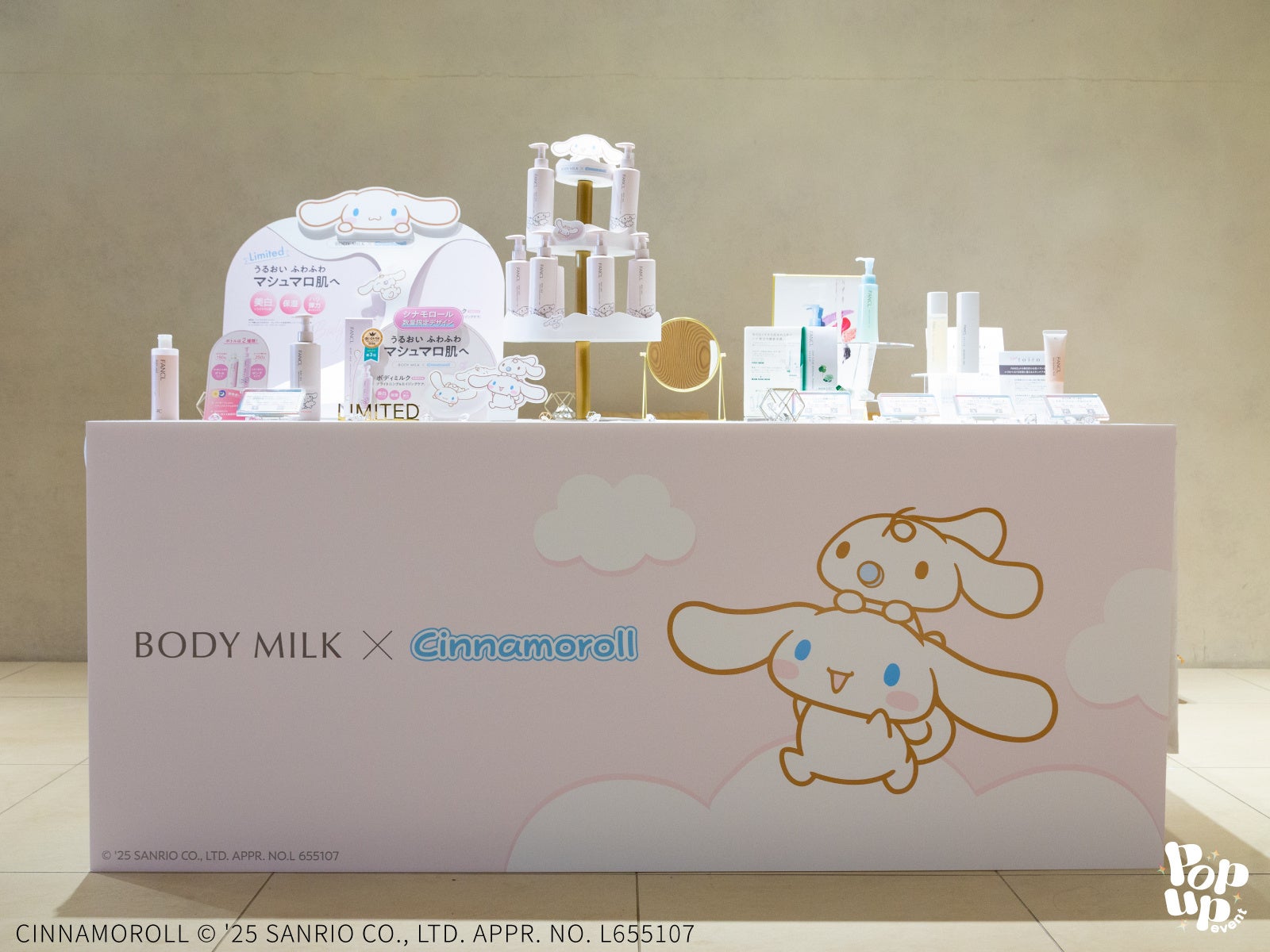 人気のサンリオキャラクター「シナモロール」が目を惹くかわいらしいブースが好印象。『ボディミルク ブライトニング&エイジングケア※<医薬部外品>』をはじめとしたボディケア・スキンケアアイテムが大集合。