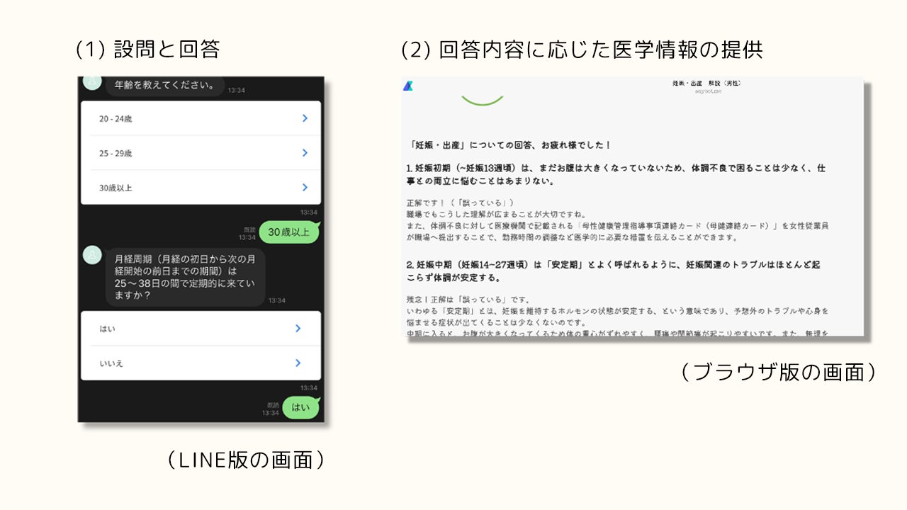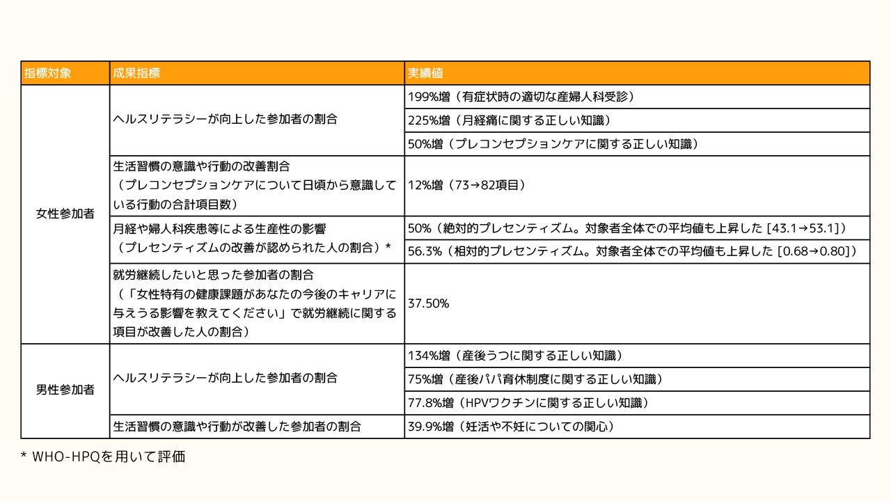 本プロジェクトでは、産婦人科医が中心となって新規に開発したeラーニングツールを用いた若手社員向けプログラムを提供し、女性特有の健康課題に関する知識や行動への効果や、生産性への影響を検証しております。