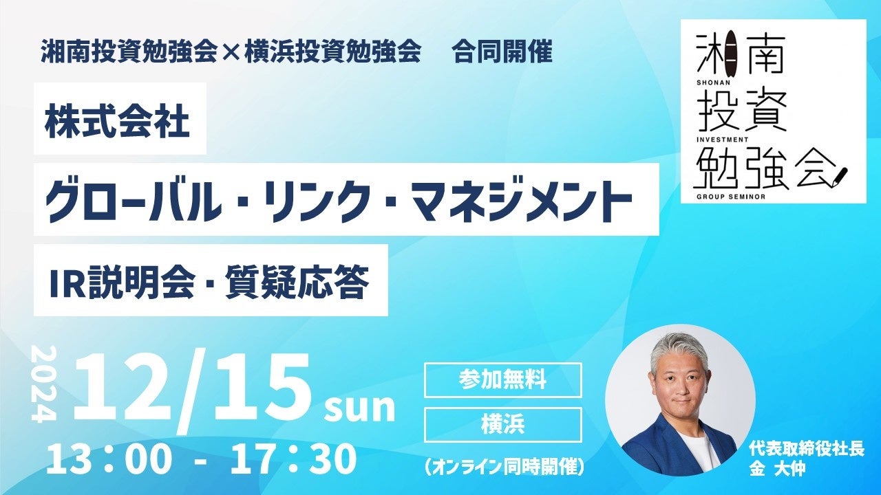 投資用不動産を扱う株式会社グローバル・リンク・マネジメント(本社:東京都渋谷区、代表取締役社長:金 大仲、証券コード:3486)は、2024年12月15日(日)、神奈川県横浜市で開催される「第61 回 湘南投資勉強会」に登壇することとなりましたので、下記のとおりお知らせいたします。