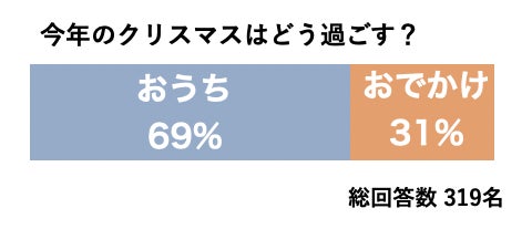 ・今年のクリスマスも『おうち』で過ごす方は7割、残りの3割はディナーやおでかけ、仕事と回答。