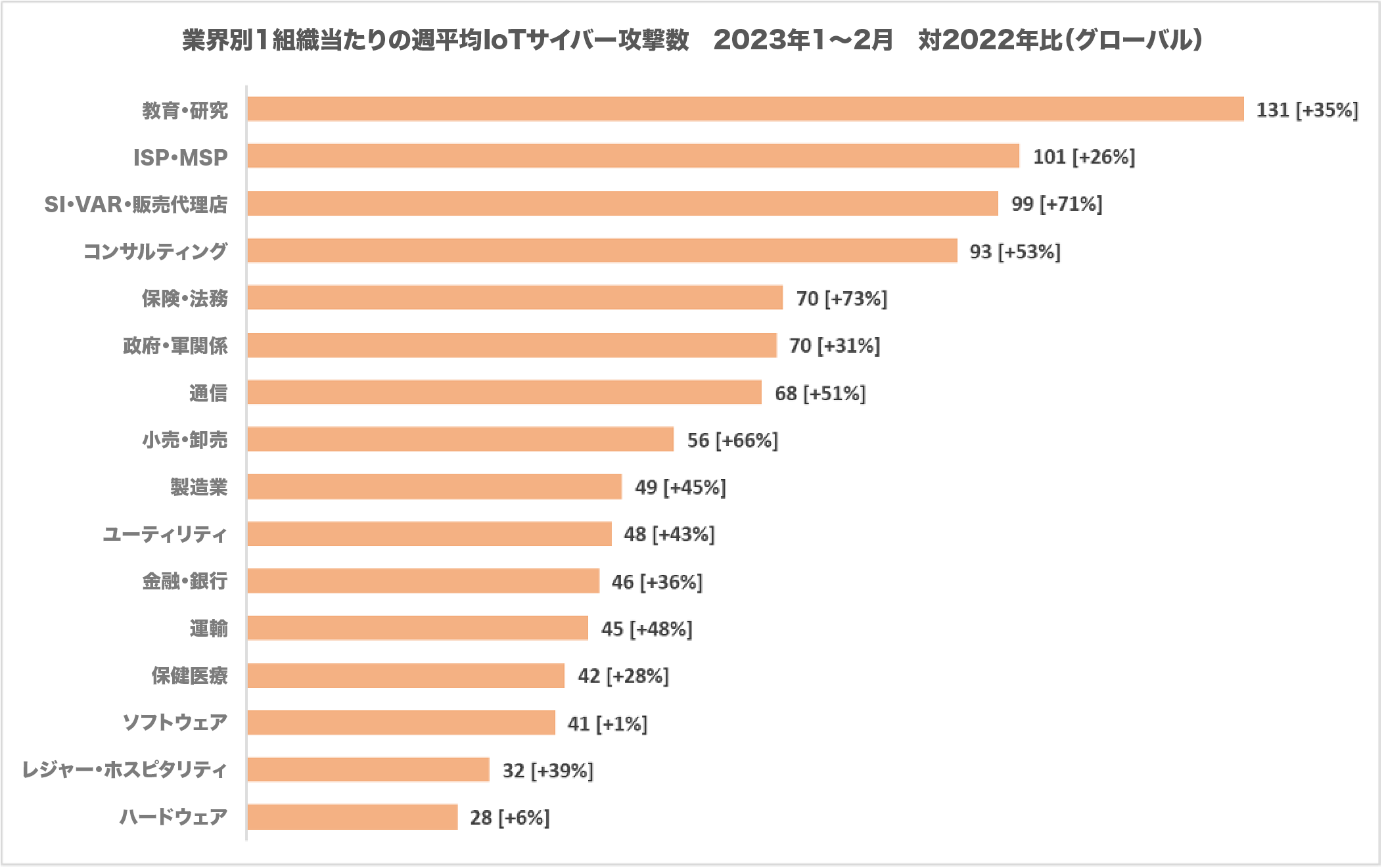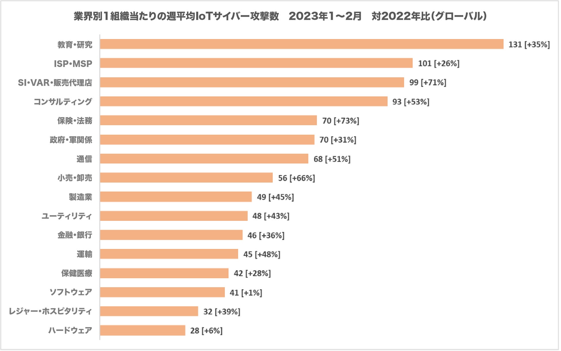 教育・研究分野は現在、IoT機器を標的とした攻撃のかつてない急増に直面しています。1組織が受けた週平均攻撃数は131件で、世界平均の2倍以上、前年比では34%増と驚異的です。その他の業界も急増する攻撃にさらされており、下のグラフが示すように、ほとんどの業界で2022年に比べ増加の割合は2ケタを記録しています。
