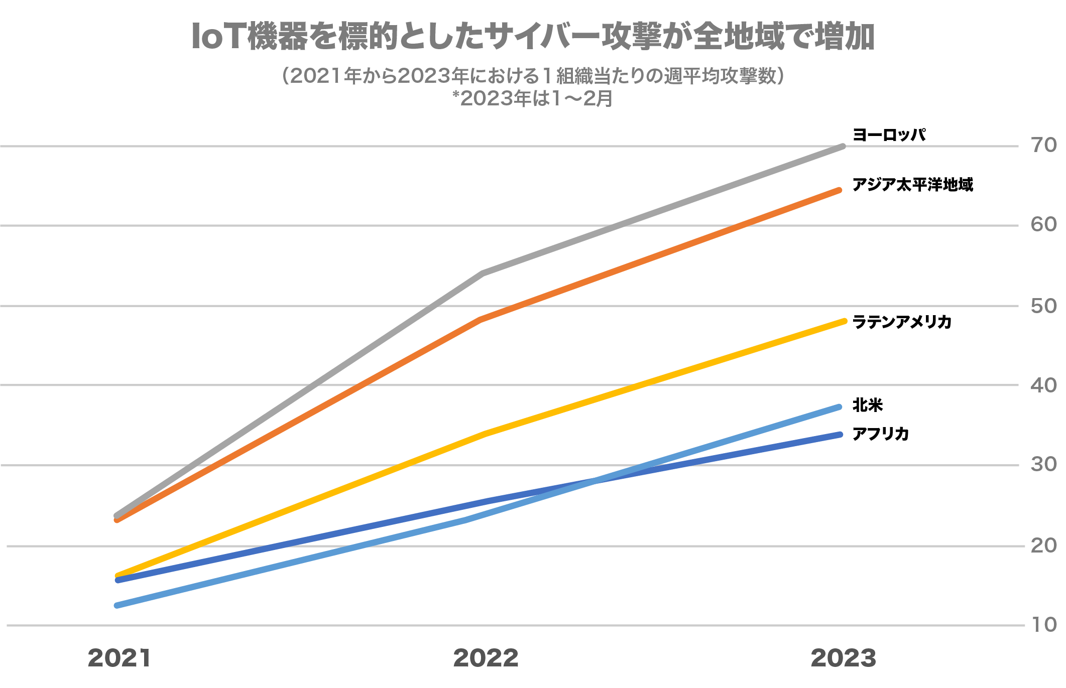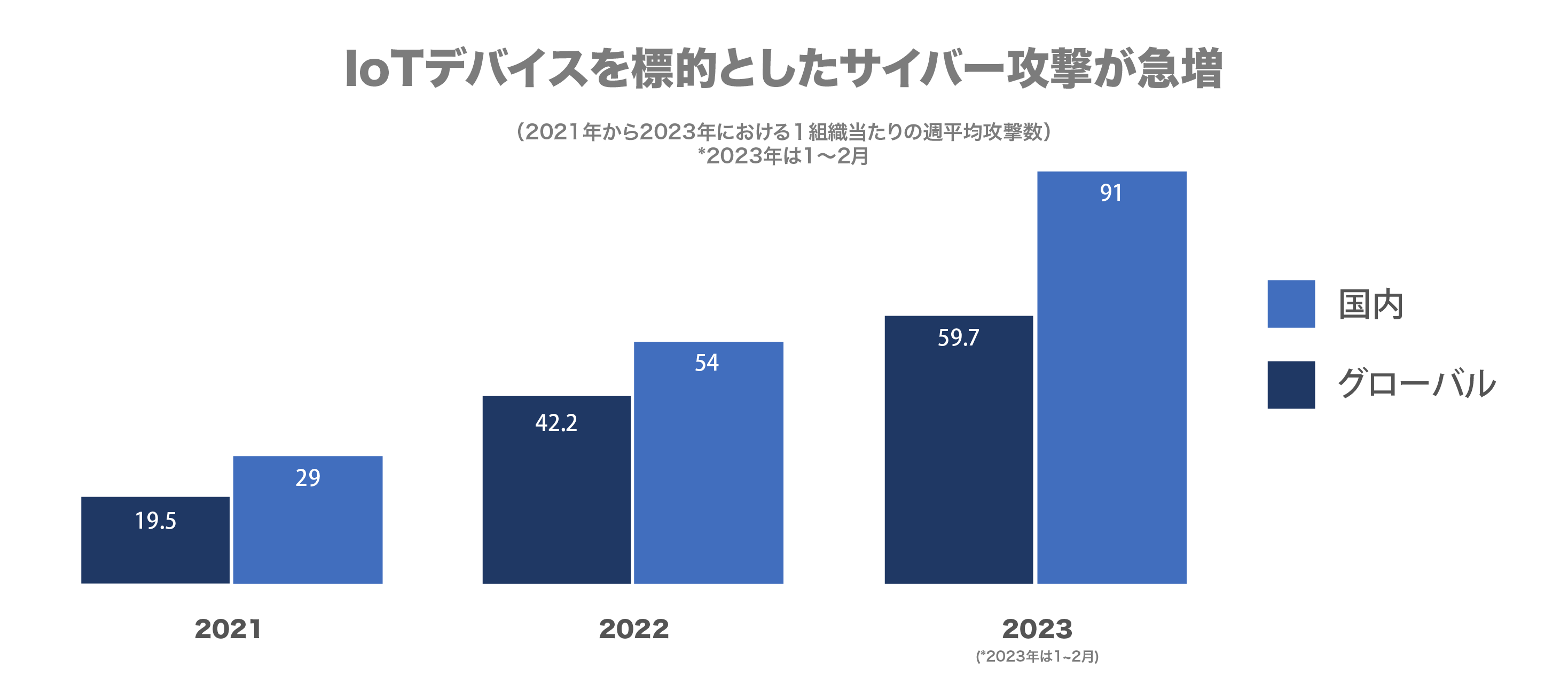 2023年1〜2月の2カ月間のIoT機器を標的とした1組織当たり週平均サイバー攻撃数は、2022年と比べグローバルで41%増加、国内で68%増加しました。