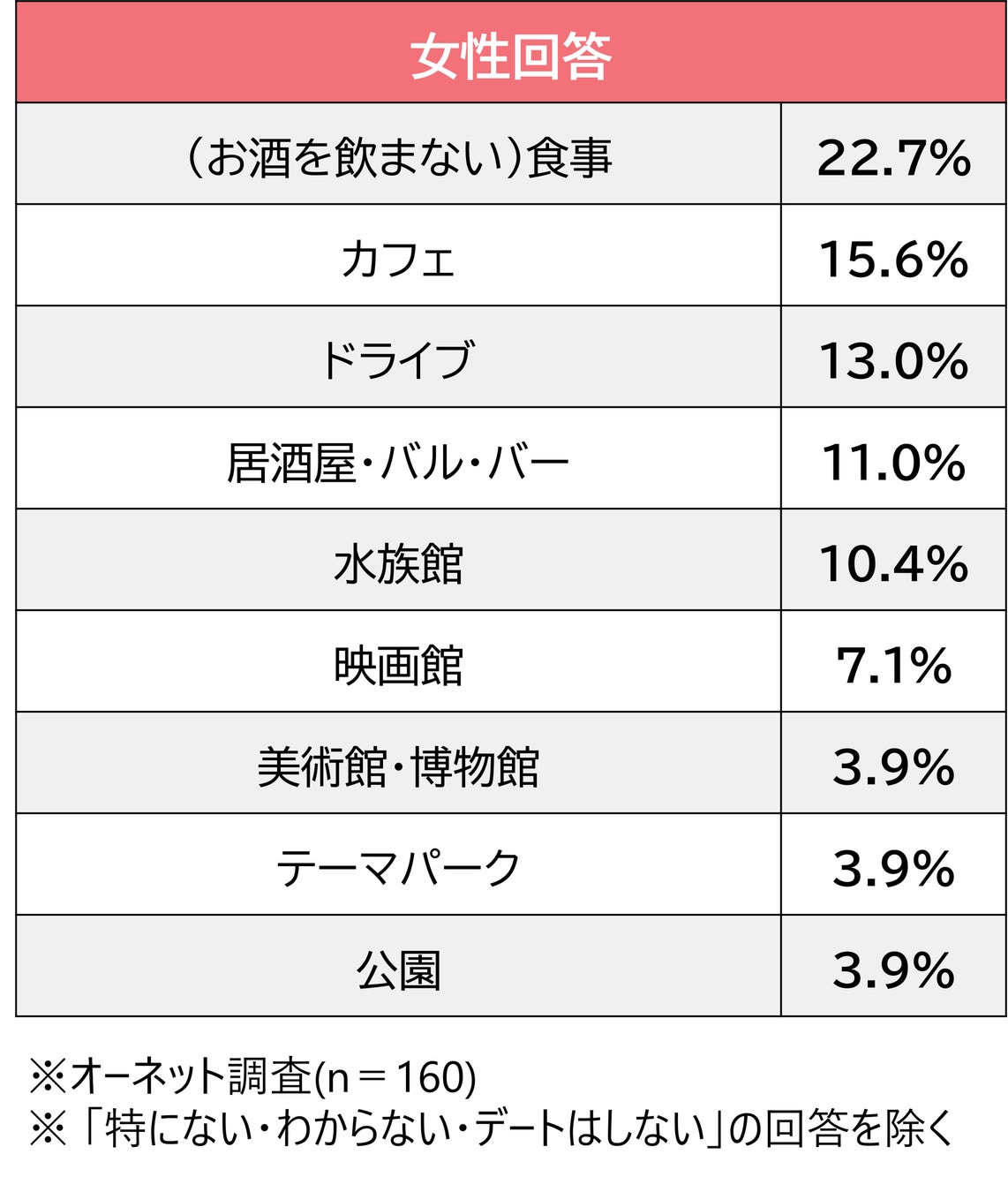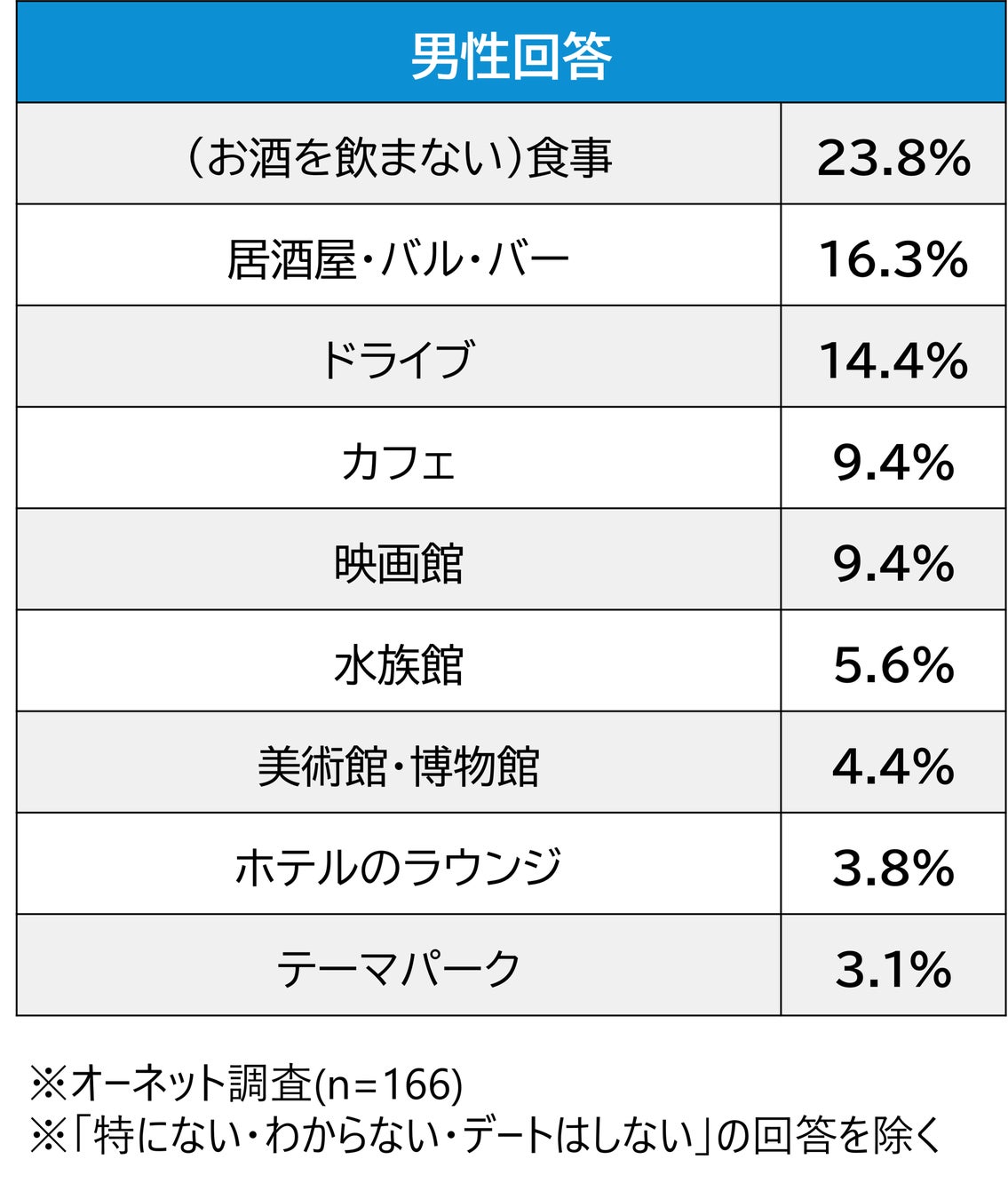一方で、女性は2位についても「カフェ」とお酒を伴わない食事となっているが、男性2位は「居酒屋・バル・バー」となっており、初デートでお酒を飲むかどうかは男女間の意識に違いがあると考えられる。