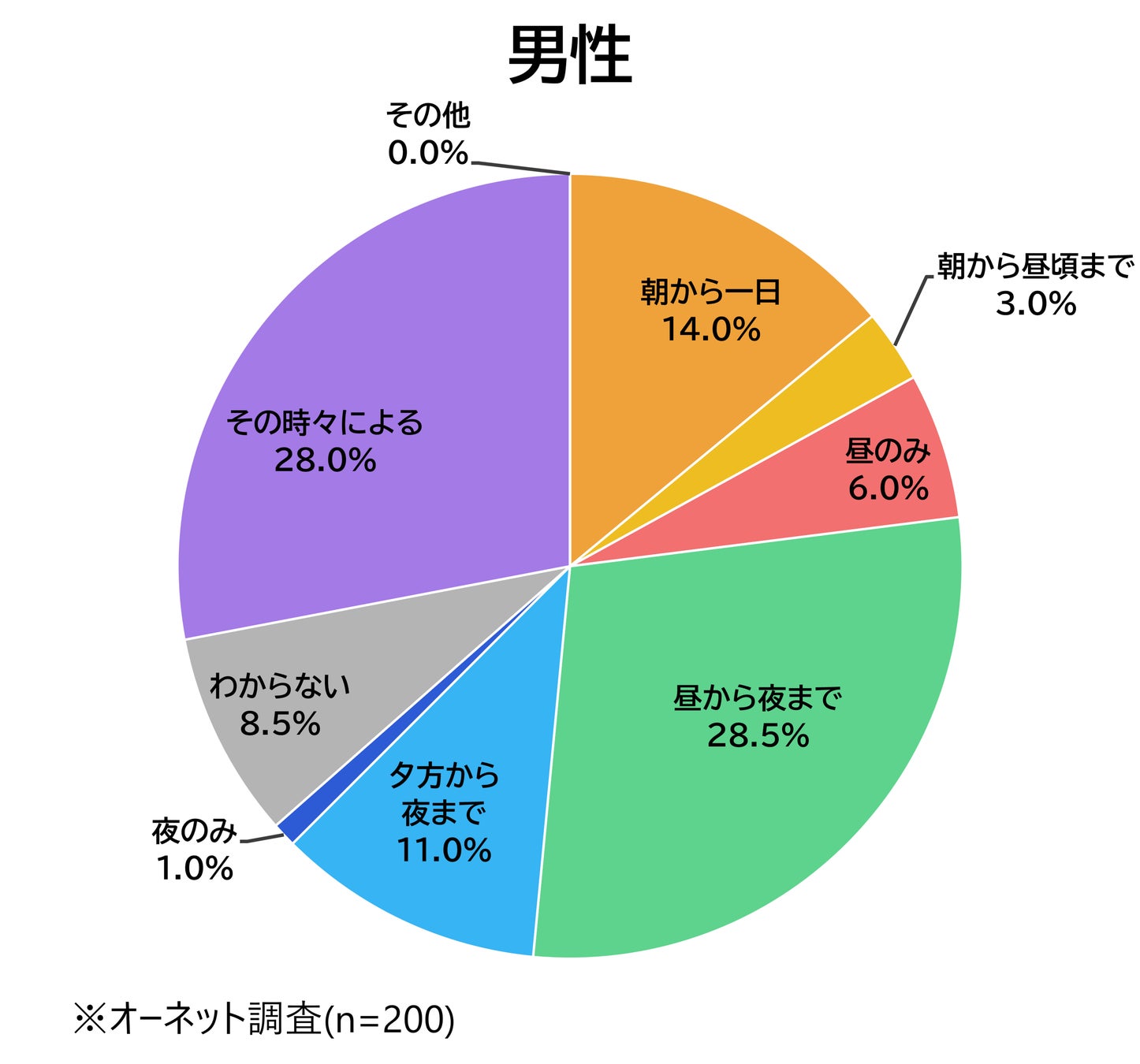 ✓ 男性は「昼から夜まで」女性は「その時々による」の回答が最も多い結果となった。