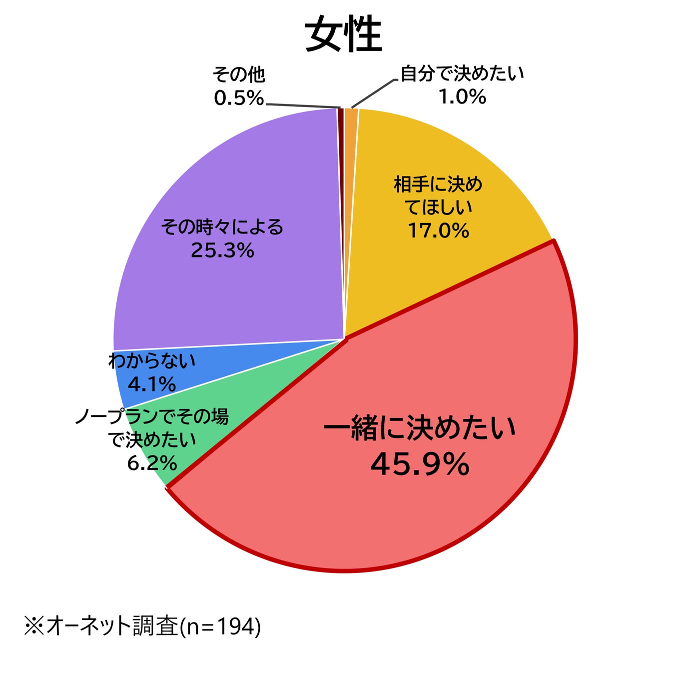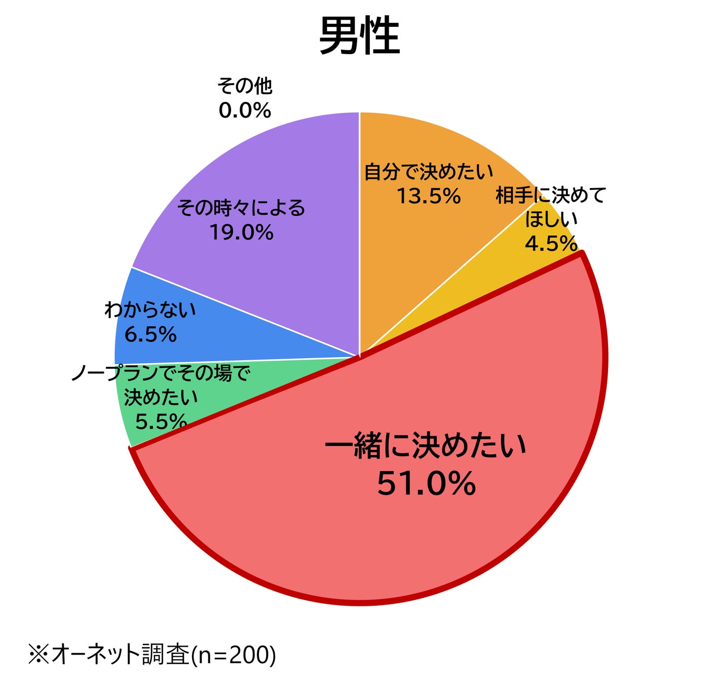 また、男女共に回答数が次に多いのが「その時々による」となっており、その時のシチュエーションやお相手によっても変わってくるのだと考えられる。デートプランは男性が決めるもの・一緒に考えるものと決めつけず、コミュニケーションを取りながら決めていくことが重要だと考えられる。