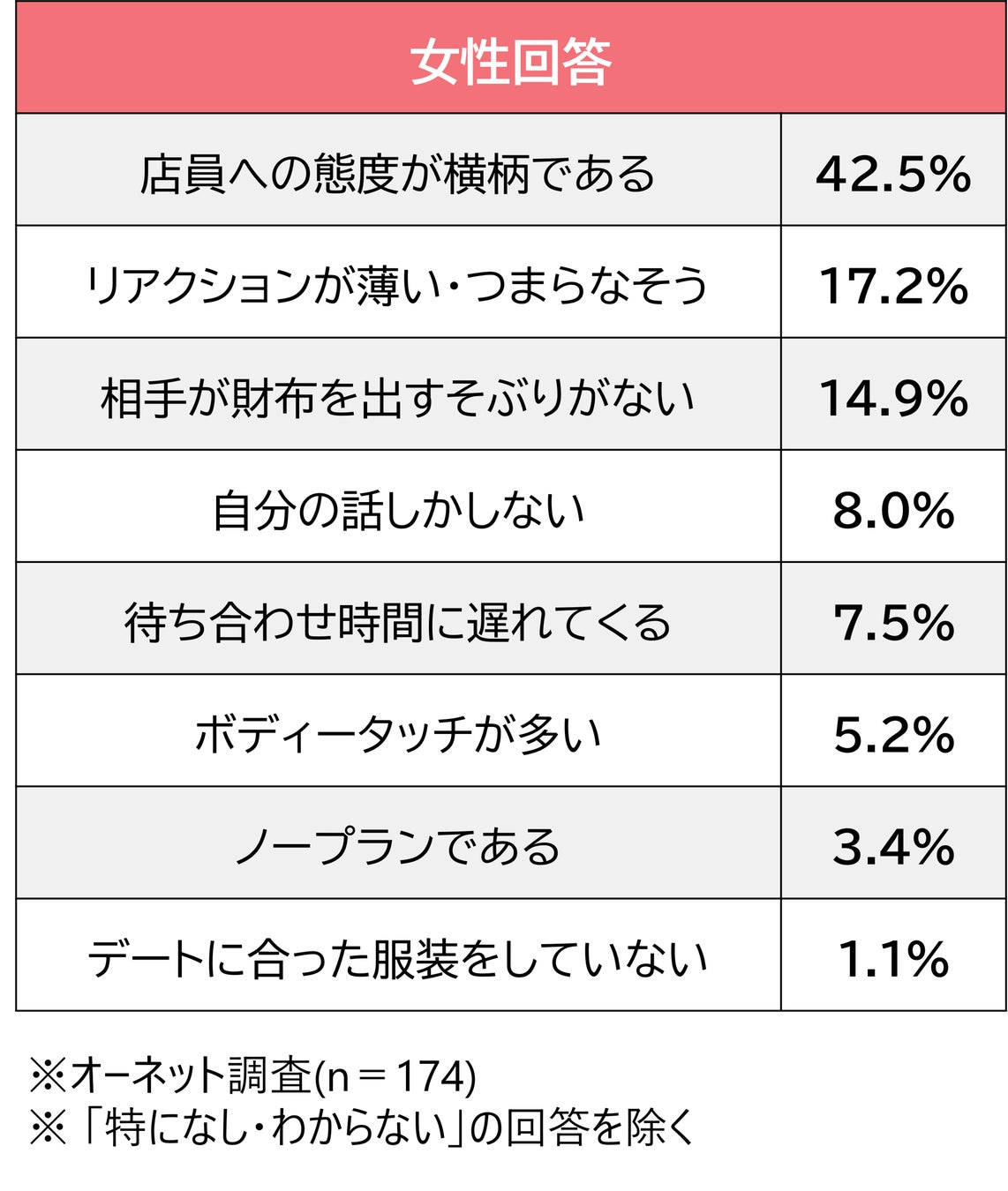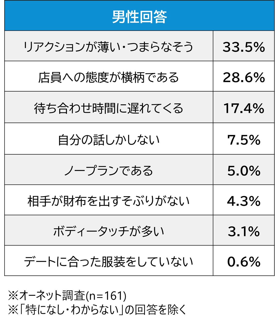 デートでのNGな行動は「店員への態度が横柄である」こと「リアクションが薄い・つまらなそう」も男女共にトップ3に