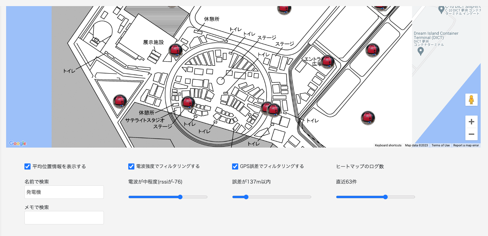 各現場の施工図、施設配置図などをアップロードし、地図上に図面を重ね合わせて表示することができる機能です。地図データが不十分な現場でも図面を登録することで、検知された機材の位置情報わかりやすく対応させ物品の所在をより早く管理することが可能です。