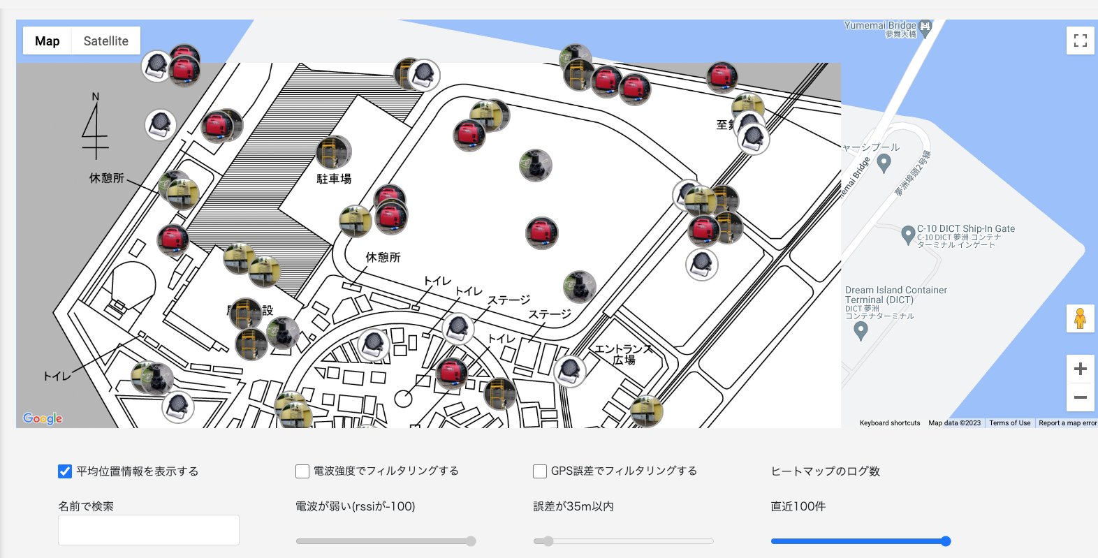 スマートフォンによるGPS位置情報の誤差や検知されたMAMORIO端末の電波強度の複数のログデータをを分析し、物品の正しい位置情報をAIを用いて分析、推定した位置情報を表示します。誤差が発生しやすいスマートフォンのGPS情報の精度を複数の検知データを補正しより正しい位置情報を表示します。