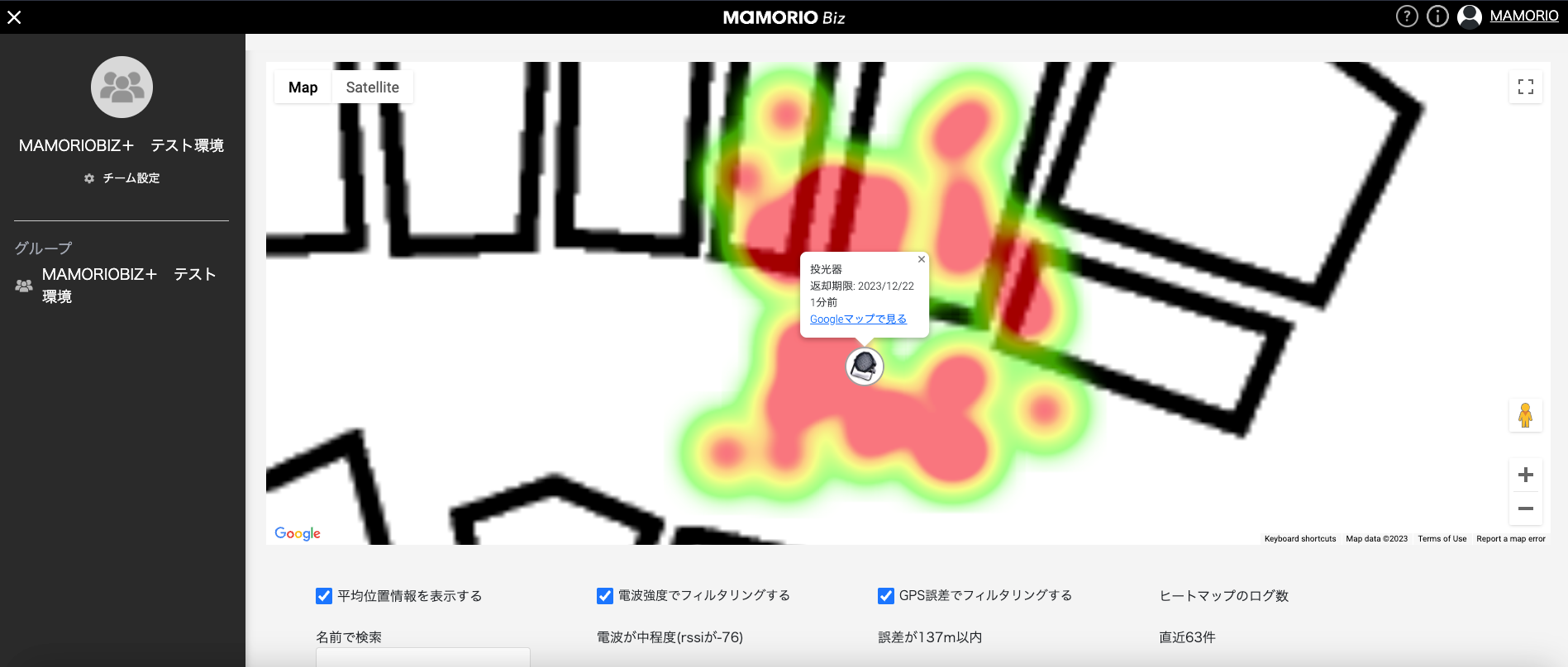 対象物品の位置情報変化をヒートマップで表示する機能です。ヒートマップで対象物品の位置情報を表示することができるので、対象物品の移動エリアを直感的に把握することが可能です。
