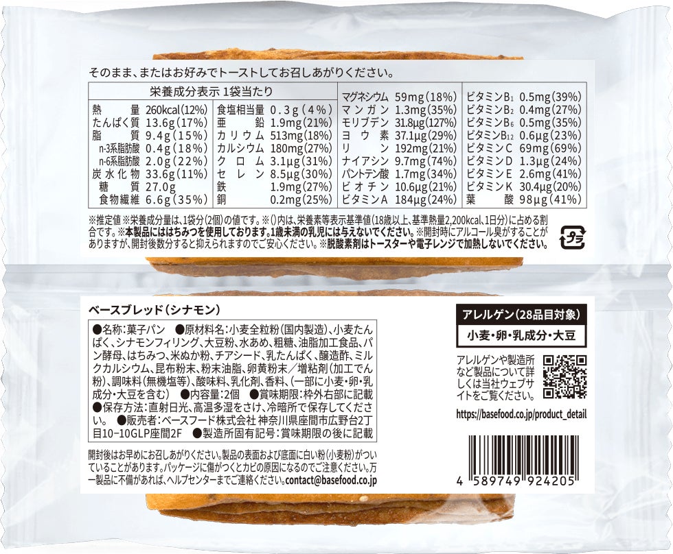 小麦全粒粉(国内製造)、小麦たんぱく、シナモンフィリング、大豆粉、水あめ、粗糖、油脂加工食品、パン酵母、はちみつ、米ぬか粉、チアシード、乳たんぱく、醸造酢、ミルクカルシウム、昆布粉末、粉末油脂、卵黄粉末/増粘剤(加工でん粉)、調味料(無機塩等)、酸味料、乳化剤、香料、(一部に小麦・卵・乳成分・大豆を含む) |