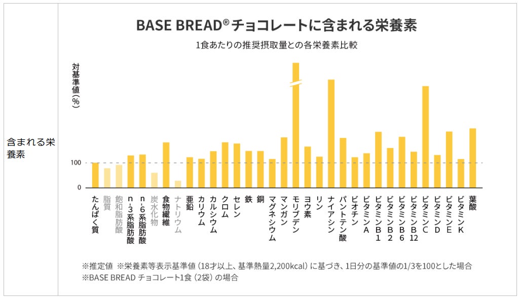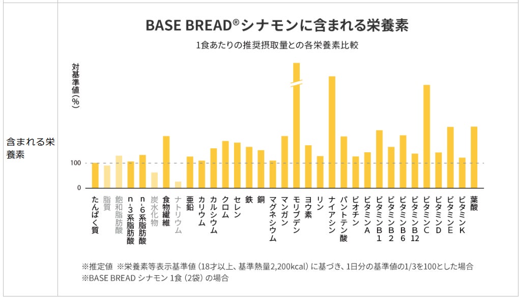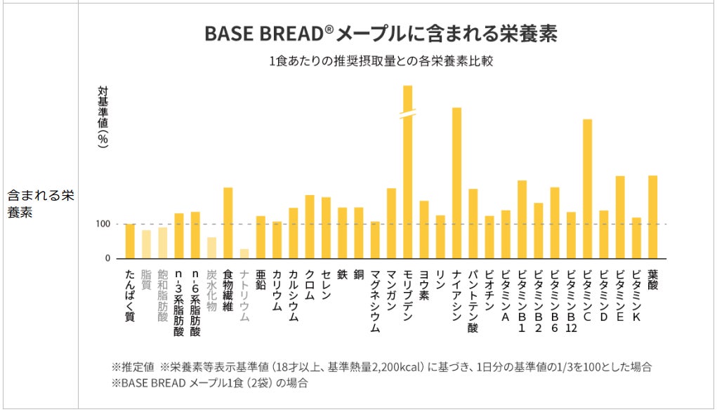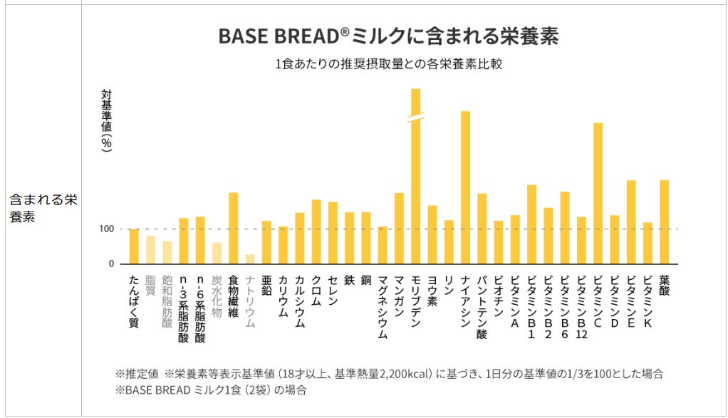*1 1食分(BASE BREADは2袋、BASE Cookiesは4袋、BASE YAKISOBAは2個、BASE Pancake Mixは1袋と卵Mサイズ1つ、牛乳(成分無調整)100mlを使用して調理した場合)で、栄養素等表示基準値に基づき、脂質・飽和脂肪酸・炭水化物・ナトリウム以外のすべての栄養素で1日分の基準値の1/3以上を含む。