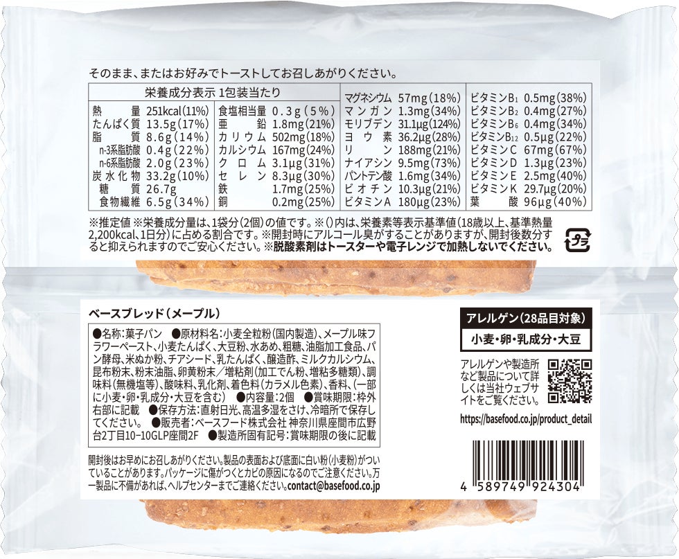小麦全粒粉(国内製造)、メープル味フラワーペースト、小麦たんぱく、大豆粉、水あめ、粗糖、油脂加工食品、パン酵母、米ぬか粉、チアシード、乳たんぱく、醸造酢、ミルクカルシウム、昆布粉末、粉末油脂、卵黄粉末/増粘剤(加工でん粉、増粘多糖類)、調味料(無機塩等)、酸味料、乳化剤、着色料(カラメル色素)、香料、(一部に小麦・卵・乳成分・大豆を含む) |