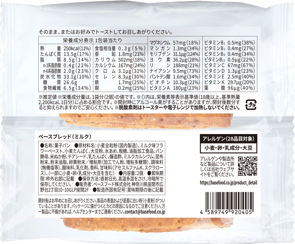小麦全粒粉(国内製造)、ミルク味フラワーペースト、小麦たんぱく、大豆粉、水あめ、粗糖、油脂加工食品、パン酵母、米ぬか粉、チアシード、乳たんぱく、醸造酢、ミルクカルシウム、昆布粉末、粉末油脂、卵黄粉末/増粘剤(加工でん粉、増粘多糖類)、調味料(無機塩等)、酸味料、乳化剤、香料、甘味料(アセスルファムK、スクラロース)、(一部に小麦・卵・乳成分・大豆を含む) |