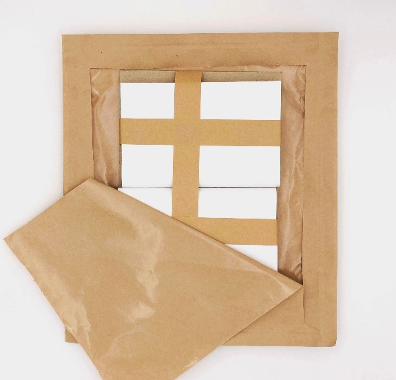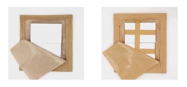 ■ポリエチレン資材を使用したシュリンクと気泡緩衝材による従来の梱包(上)と、紙バンド結束・ラミネート処理を施した紙資材による新しい梱包(下)