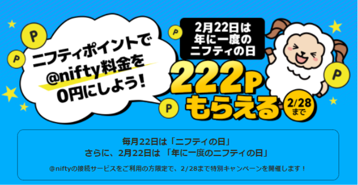 当社では、「ニフ(22)ティ」にちなみ、毎月22日を「ニフティの日」、毎年2月22日を「年に一度のニフティの日」とし、さまざまな企画を実施していく予定です。本キャンペーンは、その第1弾として実施するものです。