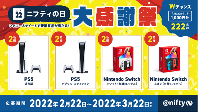 ニフティ、「年に一度のニフティの日」キャンペーンを実施~PS5™やNintendo Switch™が当たる/ニフティポイント222ポイントプレゼント~