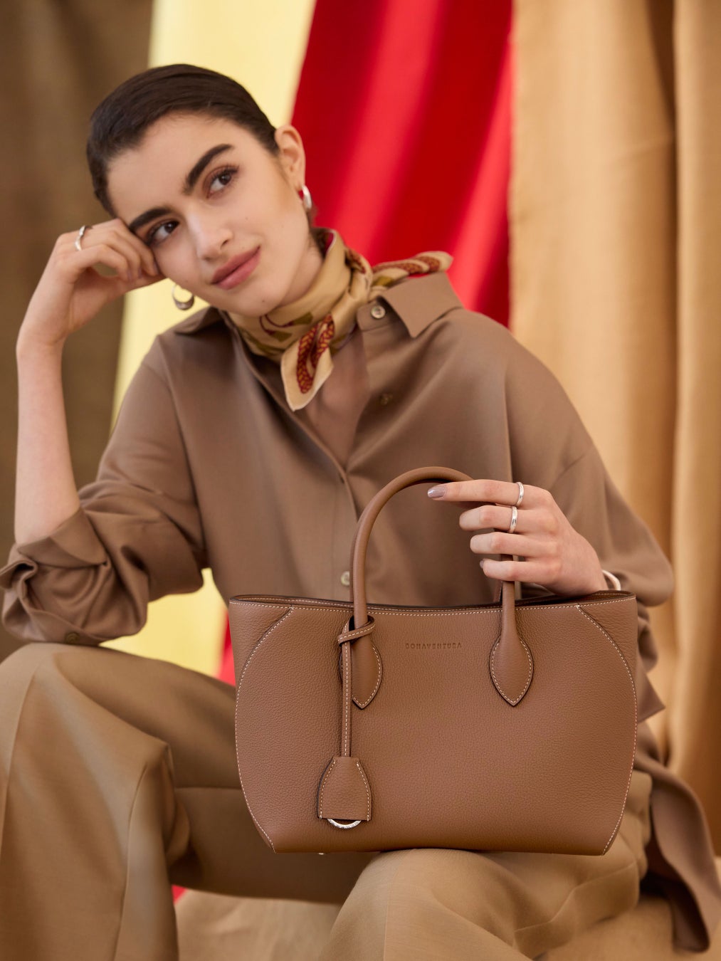 やわらかなボッタラ―トレザーの風合いと、時を超え愛されるクラシックな魅力のキャメルが織りなす落ち着きとエレガンスは、様々なスタイルにも柔らかく溶け込み、上質さを引き立てます。