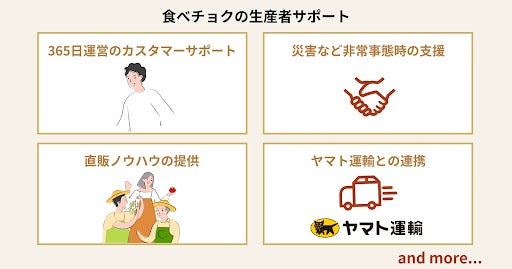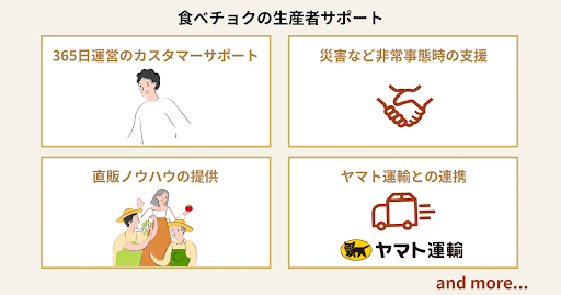 また、好みに合う⽣産者を選んでくれる野菜定期便「⾷べチョクコンシェルジュ」や旬の果物が届く定期便「⾷べチョクフルーツセレクト」なども提供。さらに、企業の福利厚生や販促キャンペーンに活用できる法人向けサービス「食べチョク for Business」も展開しています。