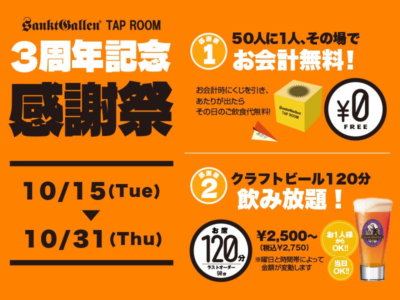 タップルームでは3周年の感謝を込め、お得な飲み放題プランを実施しているほか、お会計前のくじでアタリが出たらその日のご飲食代が無料になる抽選会を実施しています。