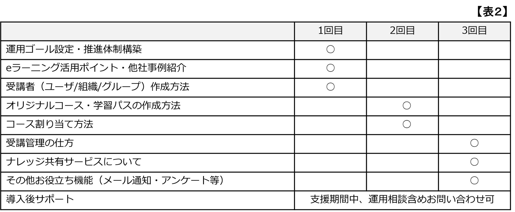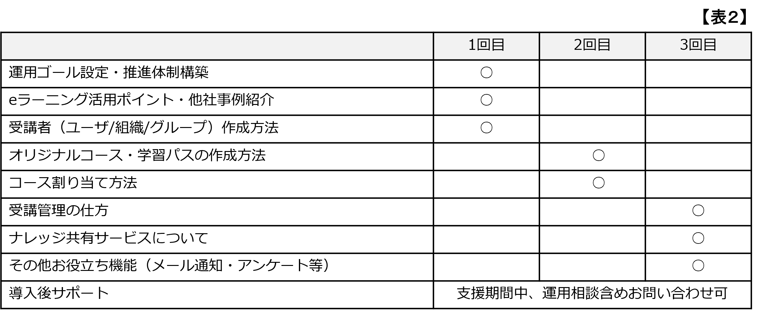 ※導入支援パックが不要とされるの場合は、運用開始時のサポート(表2に記載の1回目の支援項目3つ)と、メールでのサポートとなります。