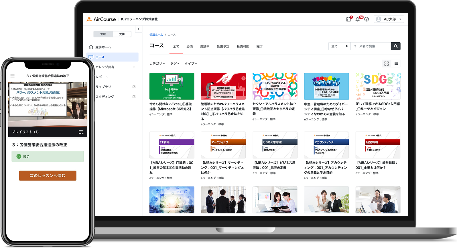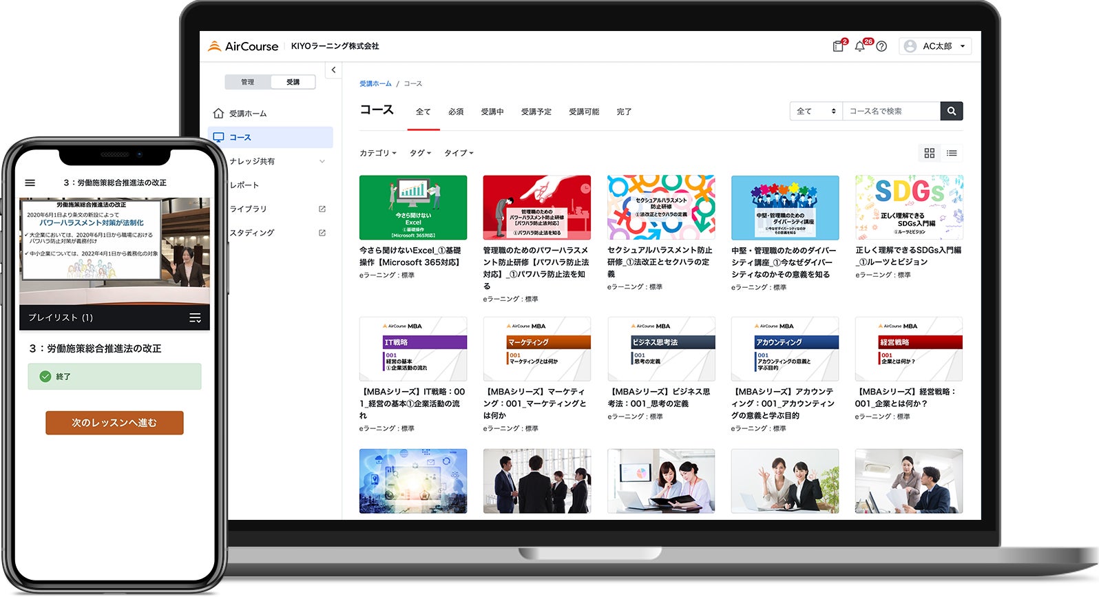 「AirCourse」(https://aircourse.com)は、企業向け社員教育eラーニングサービスです。社員教育でニーズの高い動画eラーニングコース802コース(2023年9月末時点)が受け放題となっているほか、簡単に自社の研修動画、マニュアル動画などを共有・配信できます。初期費用0円でローコストで運用でき、スマホ・PC・タブレットなどマルチデバイスに対応しています。eラーニングだけでなく、集合研修の管理や受講状況・成績レポートなどの管理機能が充実しているため、社員教育を効率化したい企業に最適です。