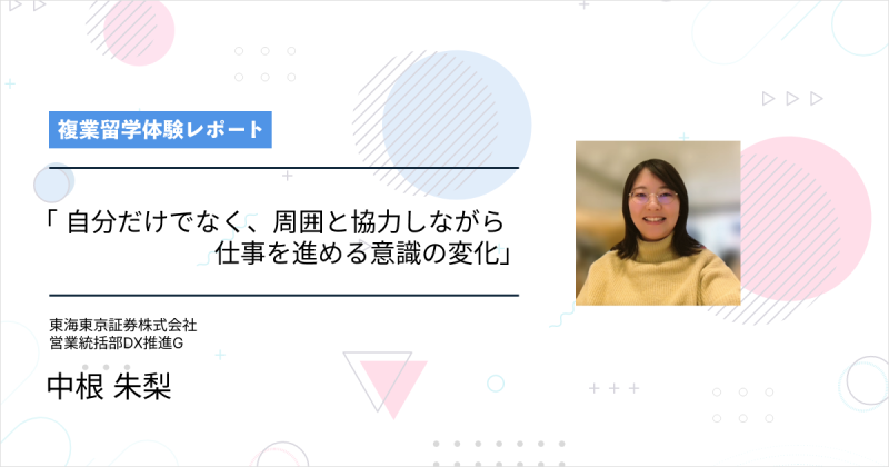 インタビュー(一部抜粋):複業留学を経験したことで、 自分一人だけでなく、周囲と協力しながら仕事を進める意識が強くなりました。自分一人で抱え込まずに周りの人に協力をお願いすることへのハードルが下がり、オープンに人を巻き込んで一緒に進めることができるようになりました。これは、複業留学の期間中に 「相談して、初めていいものが作れる」という価値感を学んだからです。また、周囲の人に対して自分が何をしているのかをより積極的に発信するようになり、それが周囲に伝わりやすくなったと思います。その結果、周囲の人も関わりやすくなったのではないかと思います。