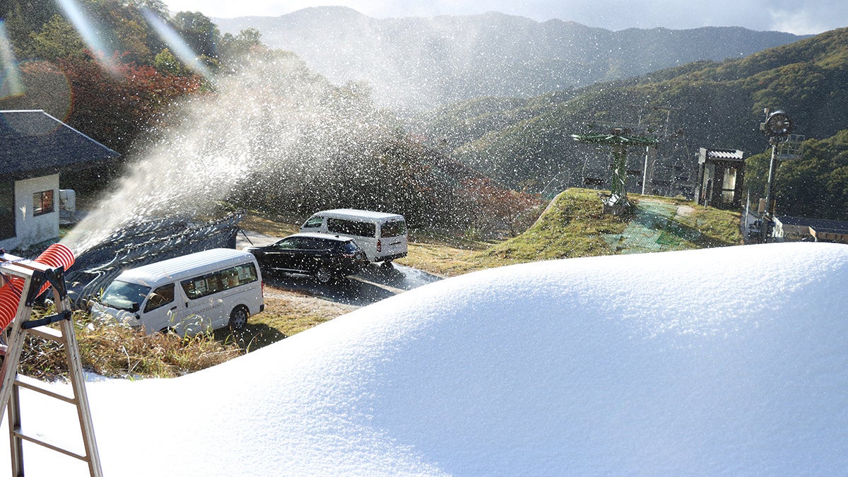 10月初旬から「全8基」を稼働させて1日「525トン」の雪造り(昨シーズンの約12倍の造雪)を行い、例年より約1ヵ月早い「過去最速11月中のスキー場オープン」を目指すと共に、シーズン終盤まで雪造りを行うことでクローズ日も10日程度延長して営業日数「150日」を目指します。