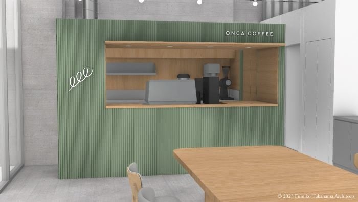 JINS東京本社は今年5月に神田へ移転しました。1棟借りしたビルを「壊しながら、つくる」をコンセプトに新進気鋭の建築家・髙濱史子氏の設計によりフルリノベーション。1階は「働けるソト」をコンセプトとし、街とのつながりを感じながら働くことのできるエリアです。新たにオープンする「ONCA COFFEE 神田店」は、同じく髙濱氏による設計で、見た目も機能もシンプルな掘立小屋をモチーフにデザイン。深い緑色のスタンドが外からでも目を引くシンボルとなっています。JINSと神田の街の接点としてJINS社員はもちろん、誰でも気軽に立ち寄りやすく自然とコミュニケーションが生まれる、そんな場所となることを目指しています。