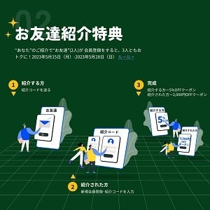 紹介した人が2人をご紹介いただき、5%OFFクーポンがもらえます。