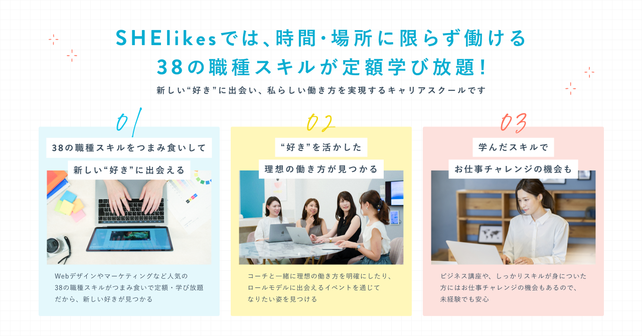 SHElikesは、時間や場所にとらわれずに働ける38以上の職種スキルが定額で学び放題の女性向けキャリアスクールです。Webデザイン・Webマーケティング・ライティングなどPC一つで働けるデジタルスキル、クリエイティブスキルを幅広く身につけることで、私らしい働き方の実現に伴走します。