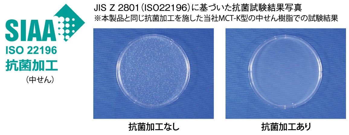 (※1)抗菌加工されていない製品の表面と比較し、細菌の増殖割合が百分の一以下であり、耐久性試験後も抗菌効果が確認されること。抗菌性は国際標準ISO22196 に準じて行われた試験の結果にもとづいて判定されます。