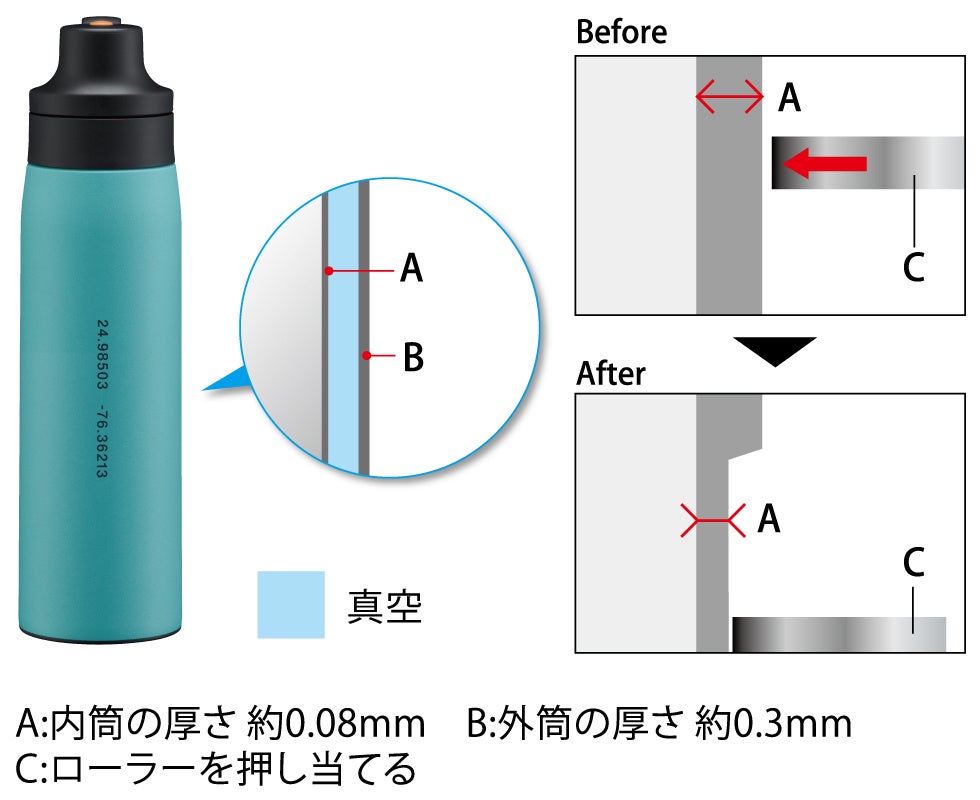 ボトルの内面には、環境負荷の高いフッ素コートを使わず、同等レベルの防染を独自の電解研磨技術「スーパークリーンPlus」加工により実現しています。なめらかで光沢のある加工で、汚れやにおいがつきにくく、さっと洗うだけで清潔にお使いいただけます。