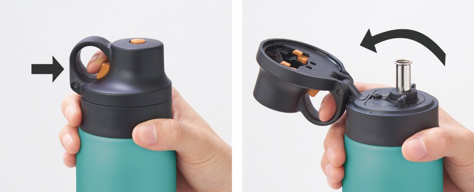 ふたの開閉部は片手で開けやすい設計の「ループせん」を採用。ボタンを押すとロックが解除され、そのままループを指で支えてふたを開ける仕組みになっています。