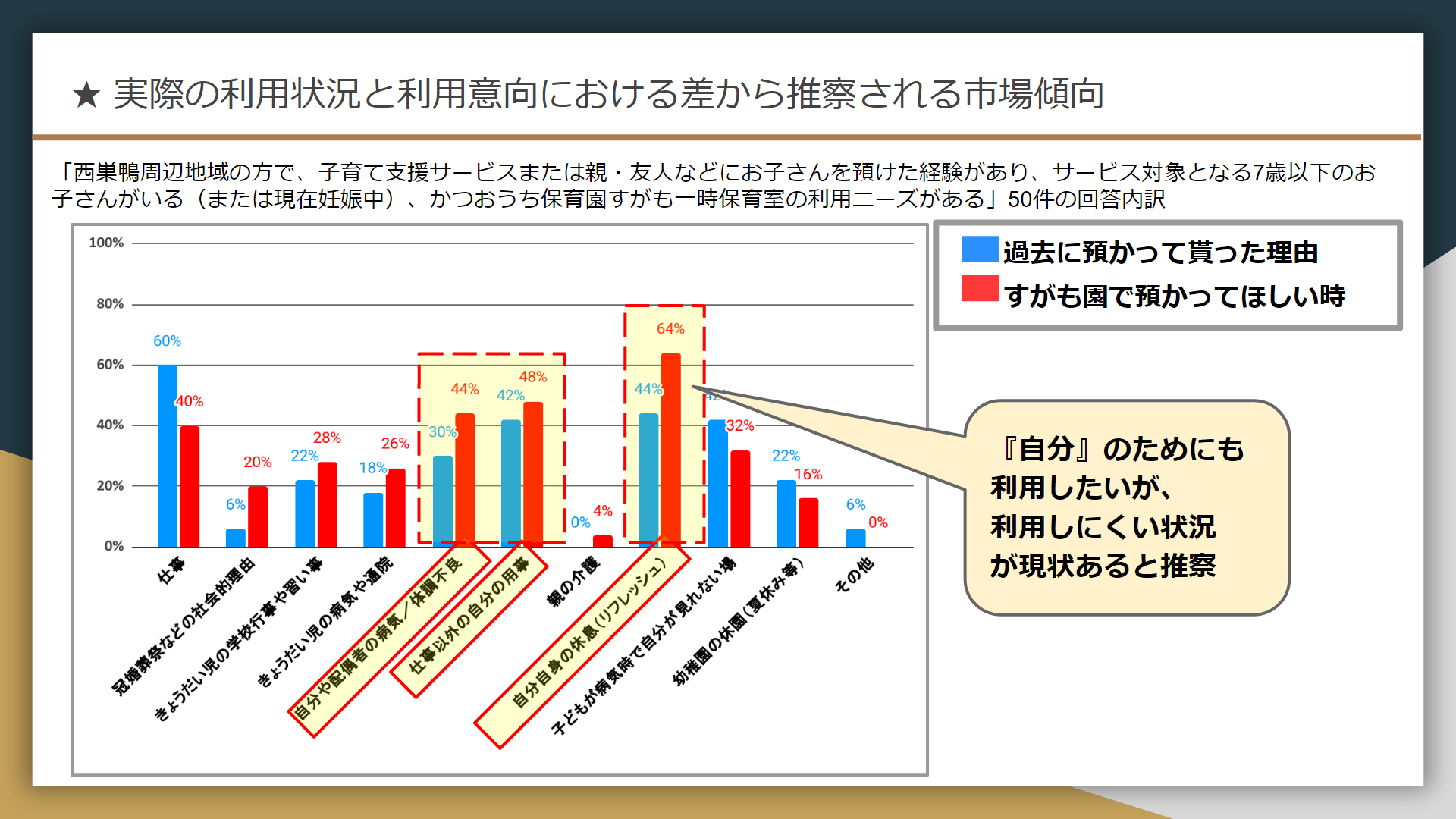 このアンケート結果から、保護者は自分自身のためにも、一時保育を利用したいと考えているが、現状は利用しにくい状況があると考え、「おうち保育園すがも一時保育室」の開設に至りました。