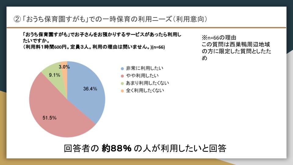 調査対象:豊島区・北区・板橋区・文京区エリアにお住まいの0-8歳のお子さんを育てている親御さんと妊娠中の方(おうち保育園すがもから半径2km以内を想定)