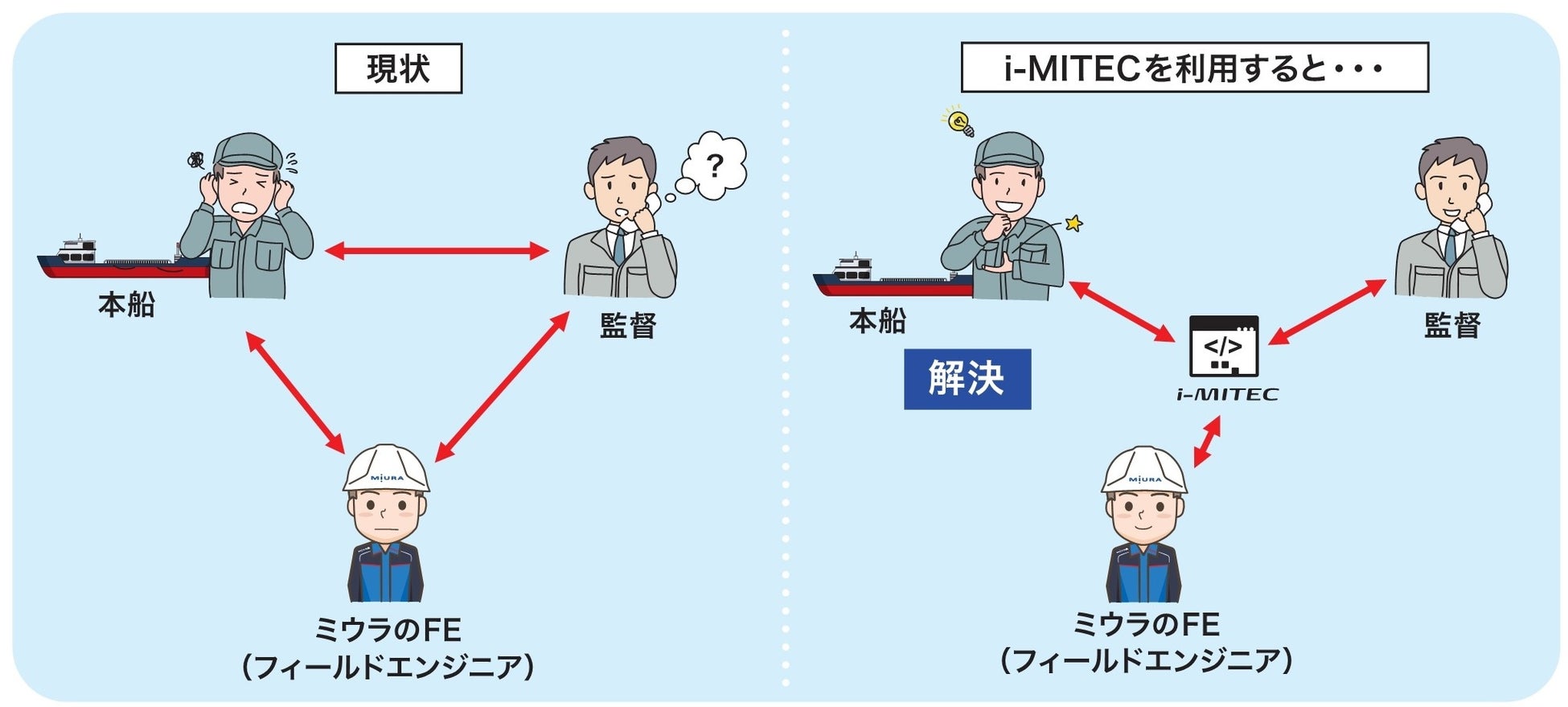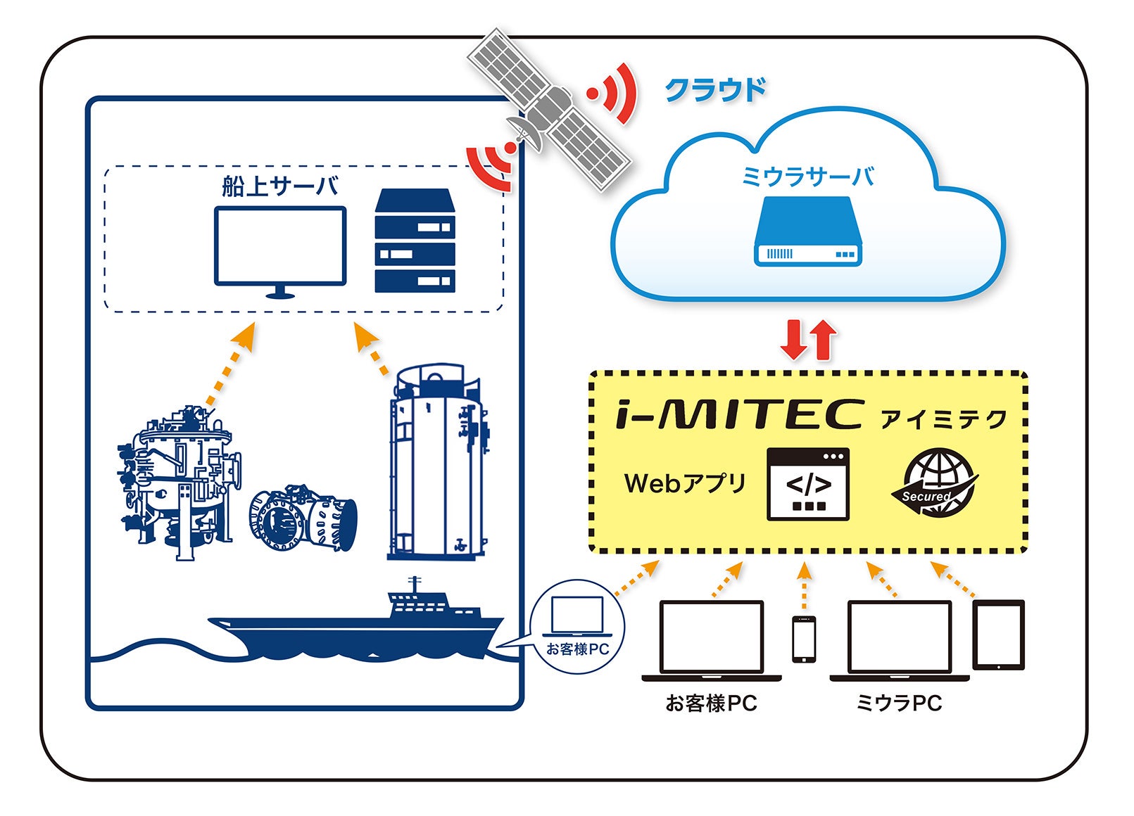 i-MITECは、通信機能を搭載した舶用補助ボイラ、バラスト水処理装置等の機器より、クラウド環境を利用して運転データを収集・蓄積して様々なサービスを提供します。蓄積したデータとミウラのフィールドエンジニアの分析を組み合わせることで、トラブル防止や燃費節約等に効果的な運転方法を提案し、お客様の機器の安全性と経済性を向上させることができます。