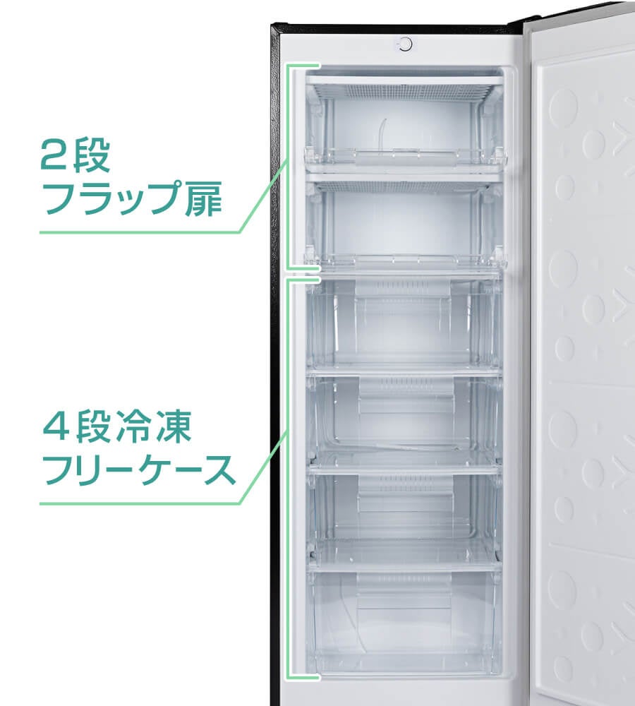 上2段はフラップ扉、下4段はフリーケースで仕切られています。まとめ買いした食材や冷凍食品など、食品ごとに分けて保存できます。