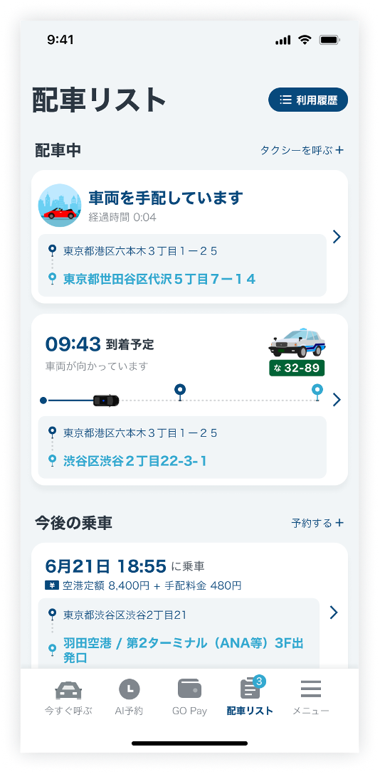 複数台配車機能の開始に合わせてアプリ内に「配車リスト」画面を新たに設けました。手配した車両と確実に出会えるよう、各車両の配車の状態をリアルタイムで確認でき、配車の詳細画面と簡単に行き来ができるようになっています。