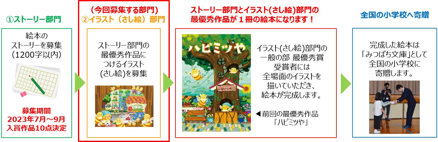 当コンクールでは、ミツバチやはちみつをテーマに「自然環境の大切さ」「社会とのつながり」「生命の尊さ」を表現した作品を募集しており、絵本のストーリー作品を募集した後、最優秀賞に選ばれた作品の内容に合わせたイラスト(さし絵)を募集する、2段階形式のコンクールです。