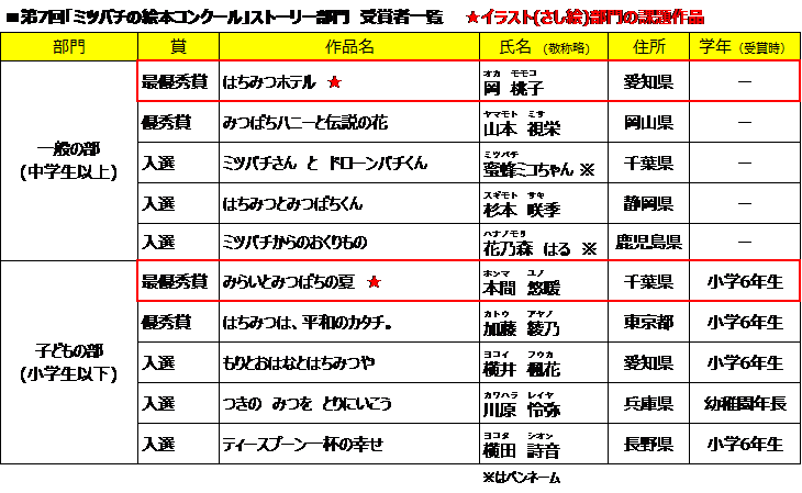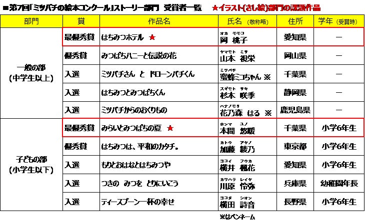 第7回「ミツバチの絵本コンクール」(主催:株式会社山田養蜂場、代表:山田英生)は、全国から寄せられたストーリー部門の応募作品より、入賞作品10点が選定され、絵本のもとになる最優秀作品は岡 桃子さん(愛知県)の作品「はちみつホテル」に決定しました。