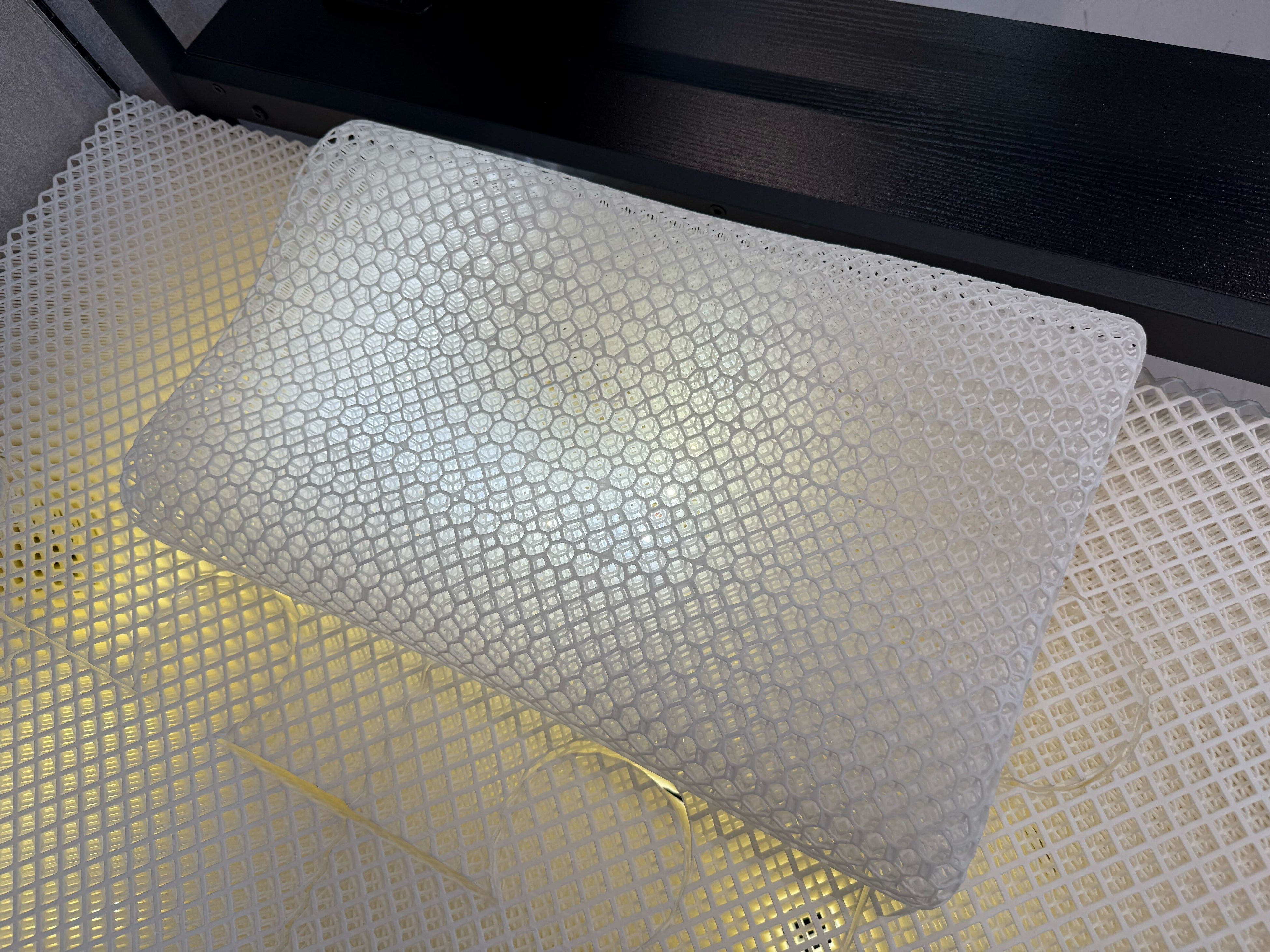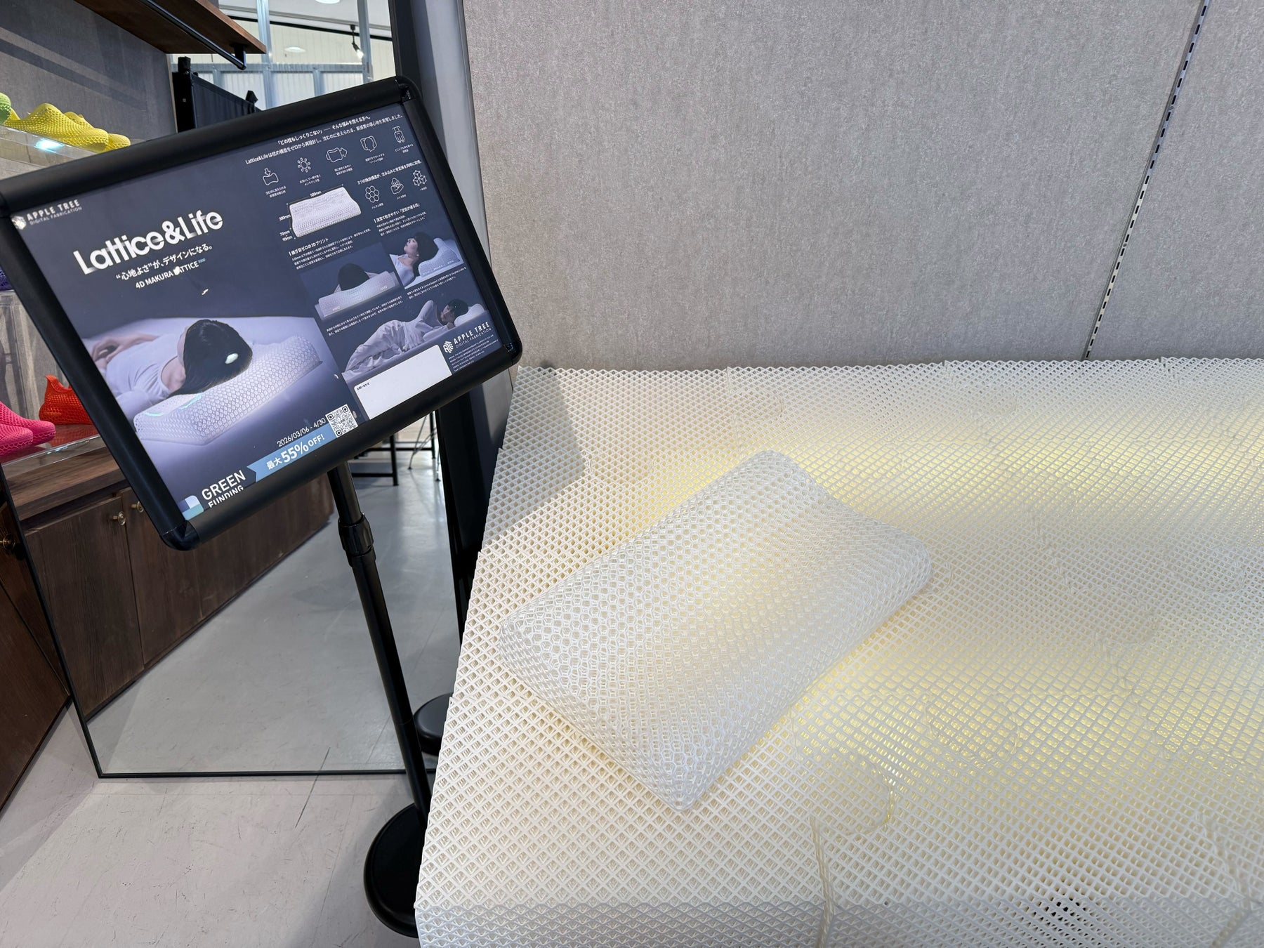 店舗で展示中の3Dプリント枕「4D MAKURA LATTICE3000」は、3月6日よりクラウドファンディングで購入可能です。最新の3Dプリント構造設計により、頭と首を自然に支える快適な寝心地を体験いただけます。