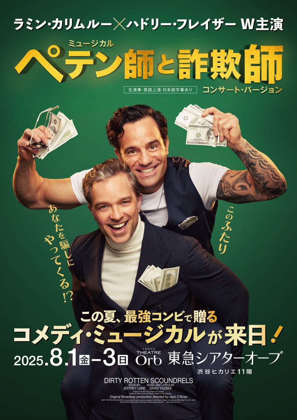 東急シアターオーブにて2025年8月1日(金)~3日(日)上演。世界的ミュージカル俳優のラミン・カリムルーが満を持してコメディミュージカルに挑戦します。タッグを組むのはハドリー・フレイザー。昨年、1日限定で上演されたロンドン・パラディアム劇場公演では、公私ともに仲が良いふたりならではの息ピッタリの掛け合いで、客席を笑いで包みこみました。多くのファンが観られなかったこの超プレミア公演を、どうしても日本のファンに届けたい!というふたりの熱い想いで来日公演が実現。相性抜群の主演コンビが、この公演のためだけに日本へやってきます。今までにない新しい彼らに出会えるこの機会をお見逃しなく。