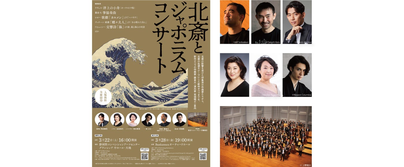 Bunkamuraオーチャードホールにて2025年3月28日(金)開催。葛飾北斎の「冨嶽三十六景 神奈川沖浪裏」に創作意欲を刺激された、ドビュッシーの交響詩「海」やラヴェルの「洋上の小舟」に代表されるように、ジャポニスムの影響を受けたクラシック音楽は数多く知られており、中でもプッチーニの「蝶々夫人」は最も影響を受けた作品と言えます。「北斎とジャポニスム」をテーマにした本公演ではそれらの作品と合わせ、藤倉大の「箏協奏曲」もご紹介します。ジャポニスムの影響をうけたクラシックの名曲とデジタル技術による北斎作品とのコラボレーションをぜひお楽しみください。