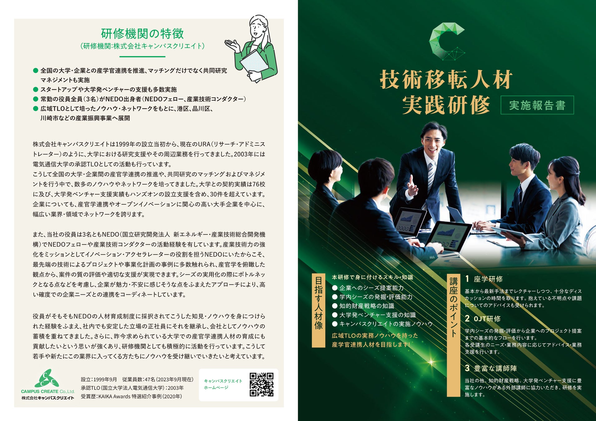 株式会社キャンパスクリエイト(東京都調布市)は、国立研究開発法人科学技術振興機構(JST)から「技術移転人材実践研修 TLO・研究支援組織開催コース」の実施機関に選定されたことを受け、2023年9月~2024年2月末にわたり、計5名の受講生に対して技術移転人材実践研修を実施しました。このたび、実施報告書を制作・公開いたしました。