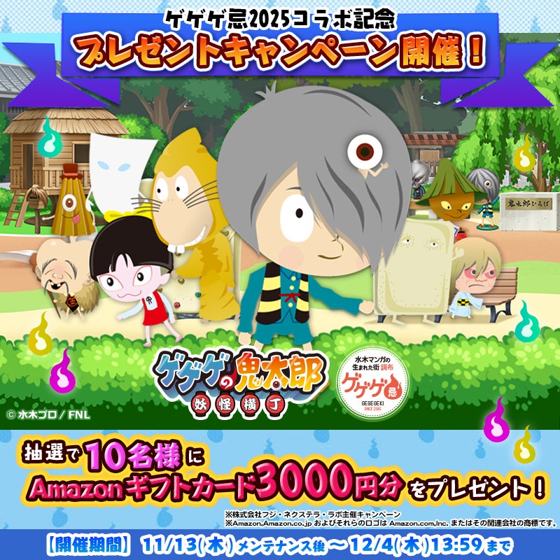 株式会社フジ・ネクステラ・ラボ(本社:東京都江東区、代表取締役社長:吉本 治)は11月13日(木)18:00(メンテナンス後)より運営中タイトル『ゲゲゲの鬼太郎 妖怪横丁』にて『ゲゲゲ忌2025』とコラボイベント「ゲゲゲ忌2025~ゲゲゲのスタンプラリ~」を開催することをお知らせいたします。