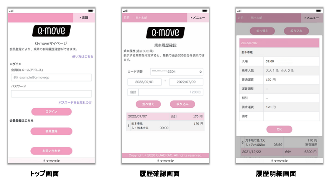 交通事業者向け決済及び認証のプラットフォームを提供するQUADRACのQ-moveサイト(https://q-move.info/)にアクセスいただき、「マイページ」の会員登録手続きの後ご覧いただけます。