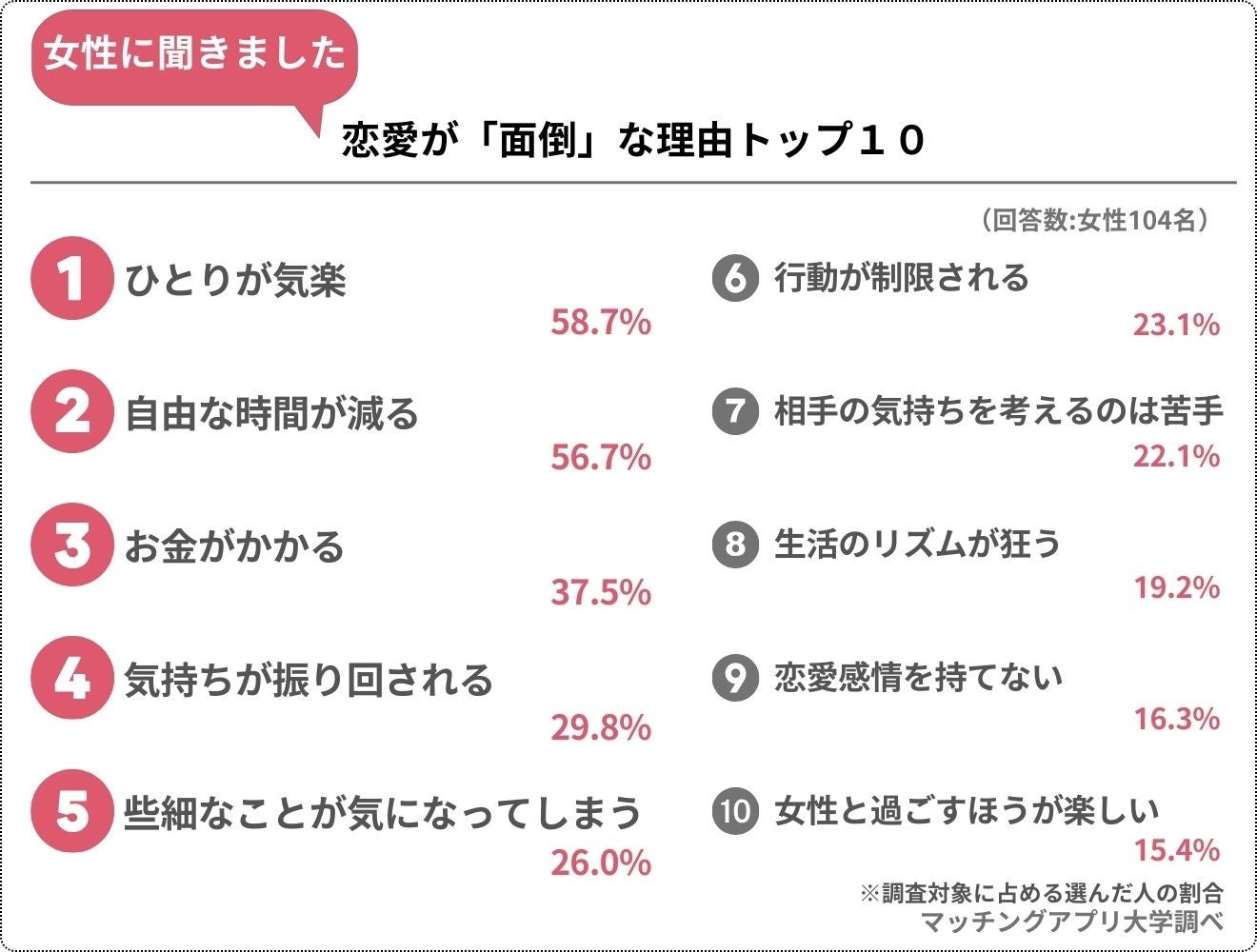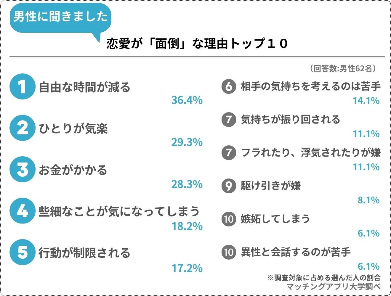 また、9位の「駆け引きが嫌だから」の中には、「恋愛どころか人と関わること自体が面倒くさいから」(千葉県・20代)といったコメントも。恋愛も突き詰めれば人付き合い。気配りや気遣いが煩わしく、コミュニケーションを取ること自体が面倒だと考えているのかもしれないですね。