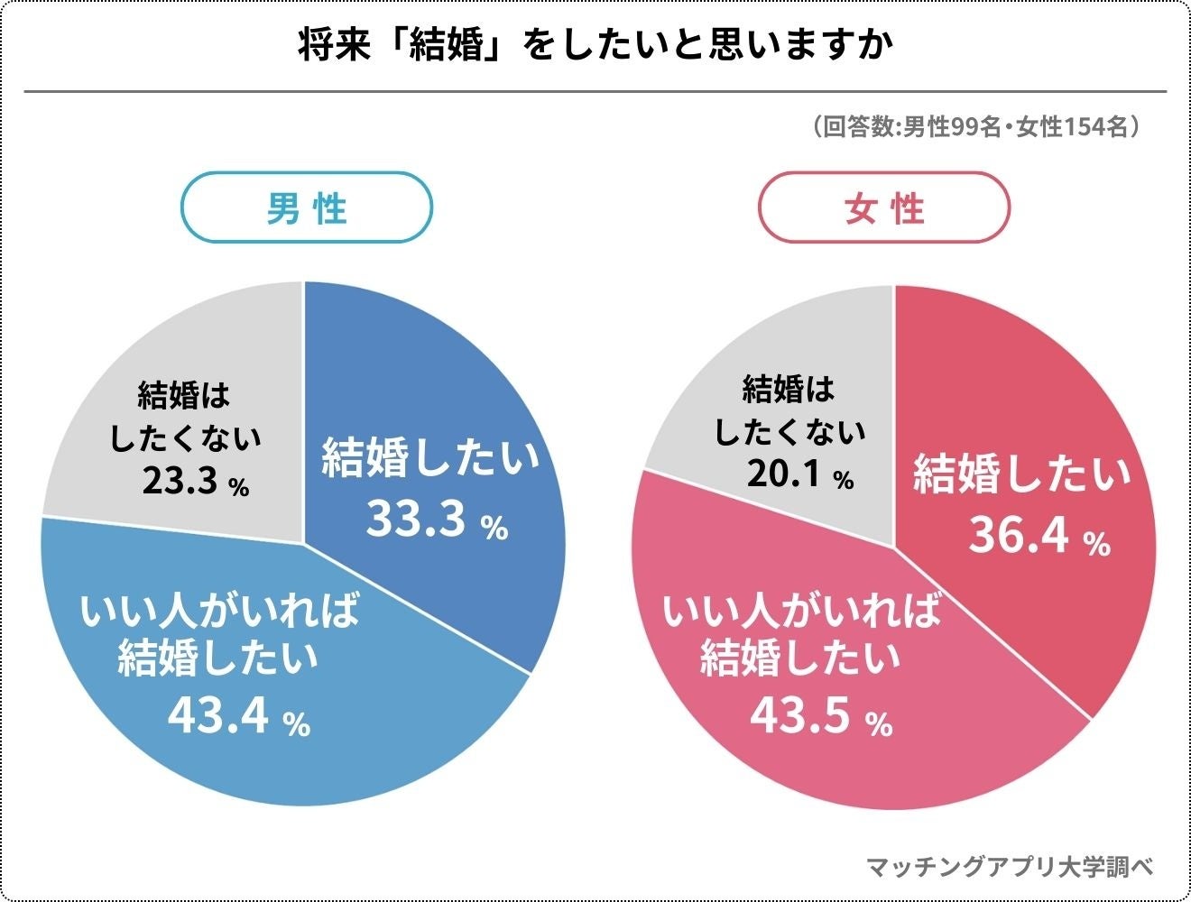今回アンケートに答えていただいた253人に「将来、結婚をしたいか」聞いてみると、「結婚したい」「いい人に出会えれば結婚したい」と回答した人の割合は、男性が76.7%、女性は79.9%と多数を占める結果に。男女とも結婚については前向きに考えていることがわかりました。
