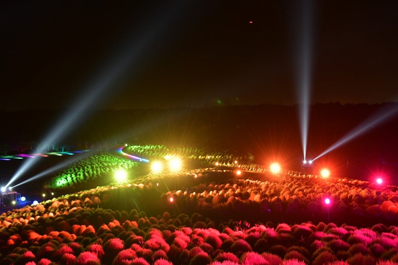 9月27日(金)~10月6日(日)までの期間、10日間限定で「コキアライトアップ」を開催します。メイン会場となる「みはらしの丘」では約4万本のコキアが音楽に合わせて、カラフルにライトアップされるショーをご覧いただけます。そのほかにも、入園口からメイン会場に至るまでの園路や樹々、施設等のライトアップやステージショー、クラフト体験や飲食ブース等も堪能できます。ご家族やご友人、大切な人と一緒にひと時をお過ごしください。