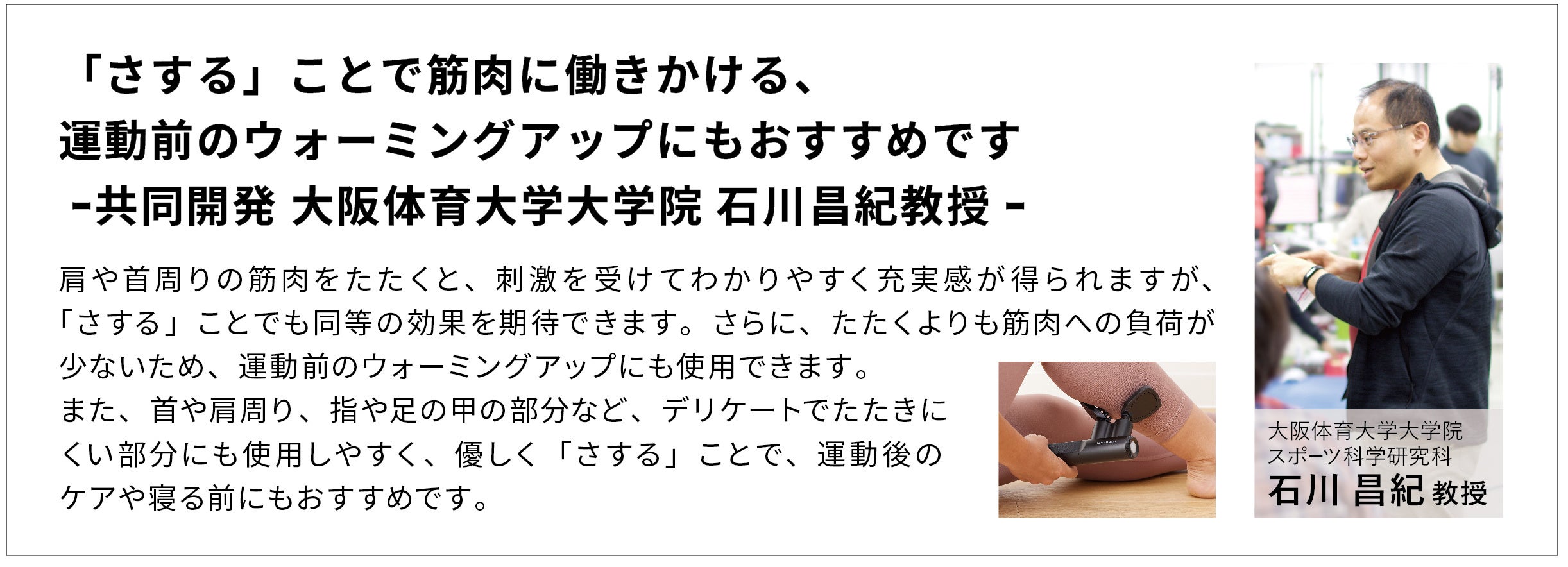 トップアスリート達をサポートする大阪体育大学大学院 石川昌紀教授と共同開発を行い、新たなケア機能を搭載しました。